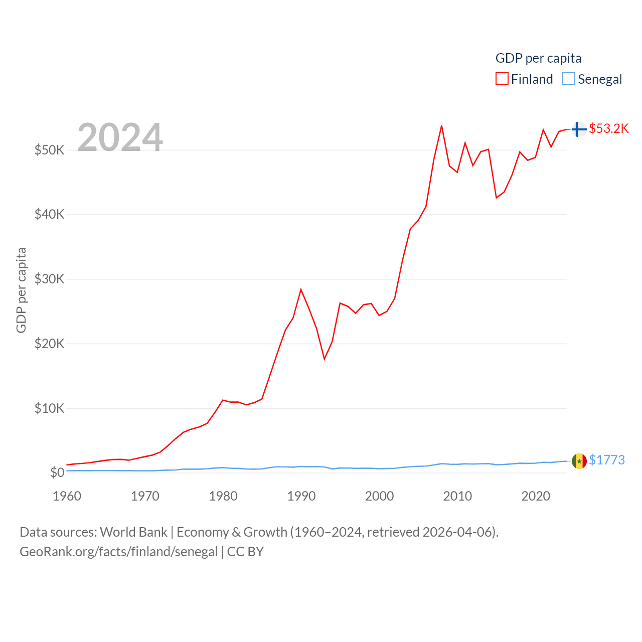 By GDP, Finland ranks 47/197 ($299B) and Senegal ranks 109/197 ($32.8B). By GDP per capita, Finland ranks 23/197 ($53,150), while Senegal ranks 159/197 ($1,773).