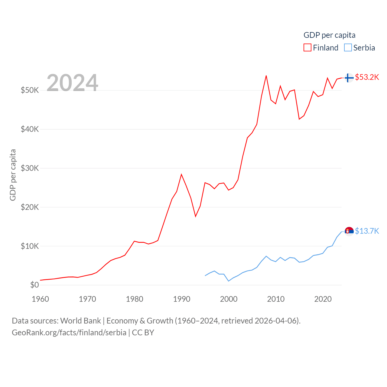 By GDP, Finland ranks 47/197 ($299B) and Serbia ranks 76/197 ($90.1B). By GDP per capita, Finland ranks 23/197 ($53,150), while Serbia ranks 73/197 ($13,679).