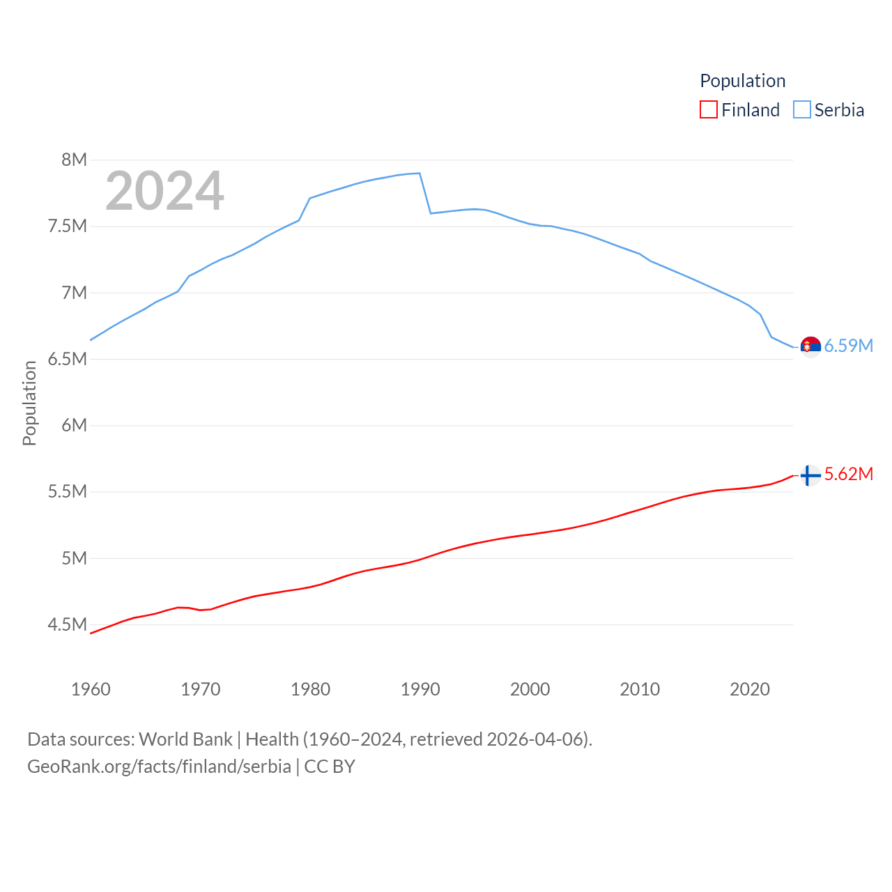 Finland has a population of 5.62M (ranked 116/197), compared with 6.59M in Serbia (ranked 109/197). Finland's land area is 117,360 sq mi versus 32,467 sq mi for Serbia (ranked 70th vs. 111th).