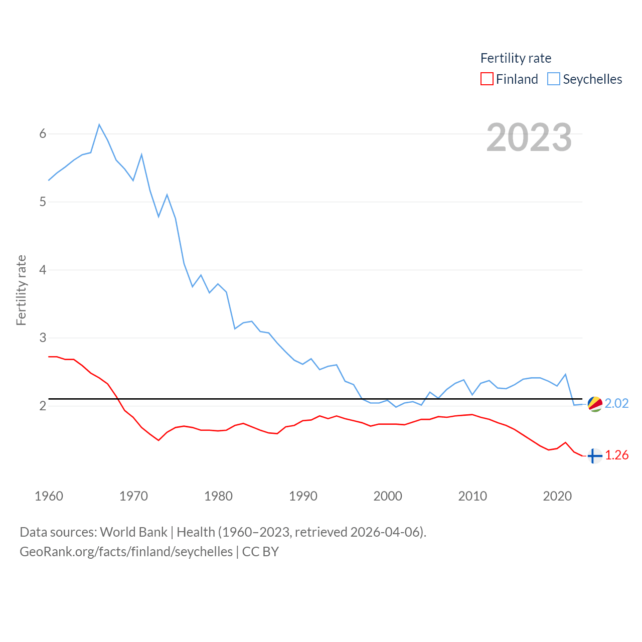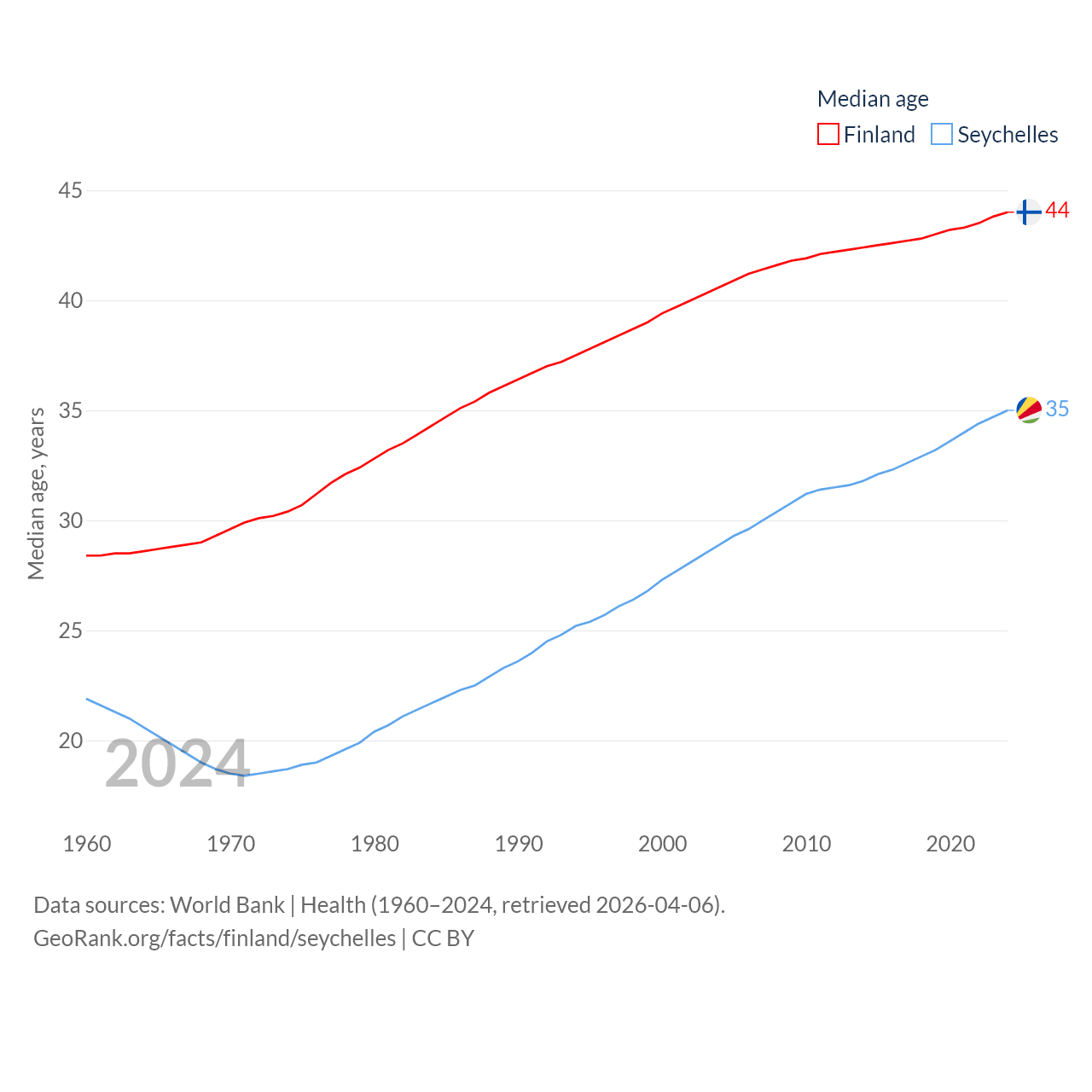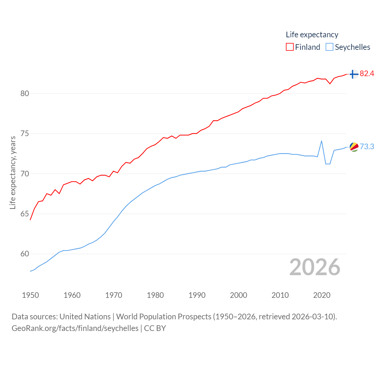 Finland has a population of 5.62M (ranked 116/197), compared with 121K in The Seychelles (ranked 181/197). Finland's land area is 117,360 sq mi versus 177.6 sq mi for The Seychelles (ranked 70th vs. 181st).