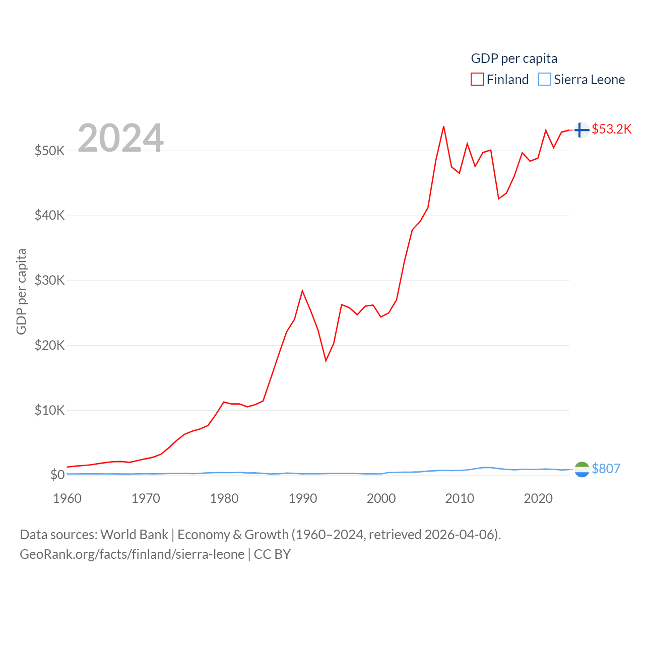 By GDP, Finland ranks 47/197 ($299B) and Sierra Leone ranks 160/197 ($6.97B). By GDP per capita, Finland ranks 23/197 ($53,150), while Sierra Leone ranks 186/197 ($807).