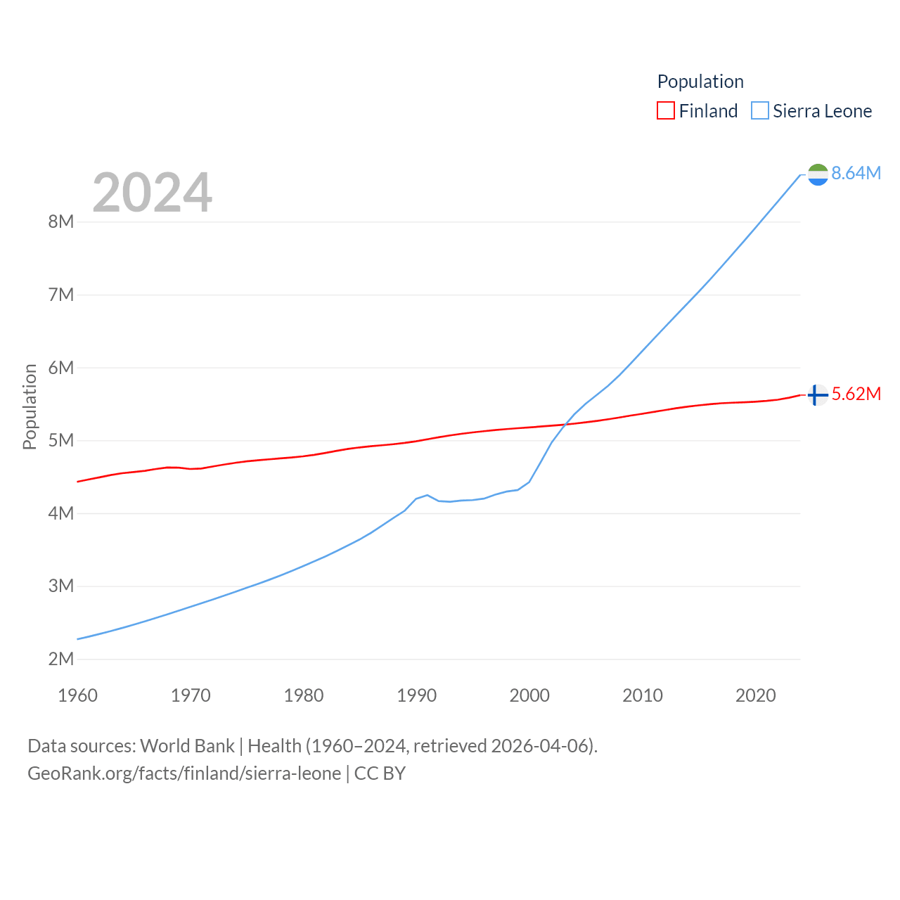 Finland has a population of 5.62M (ranked 116/197), compared with 8.64M in Sierra Leone (ranked 102/197). Finland's land area is 117,360 sq mi versus 27,869 sq mi for Sierra Leone (ranked 70th vs. 116th).