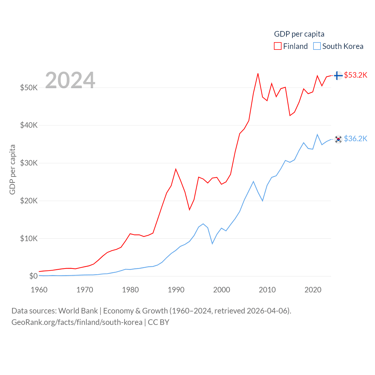 By GDP, Finland ranks 47/197 ($299B) and South Korea ranks 12/197 ($1.88T). By GDP per capita, Finland ranks 23/197 ($53,150), while South Korea ranks 31/197 ($36,239).