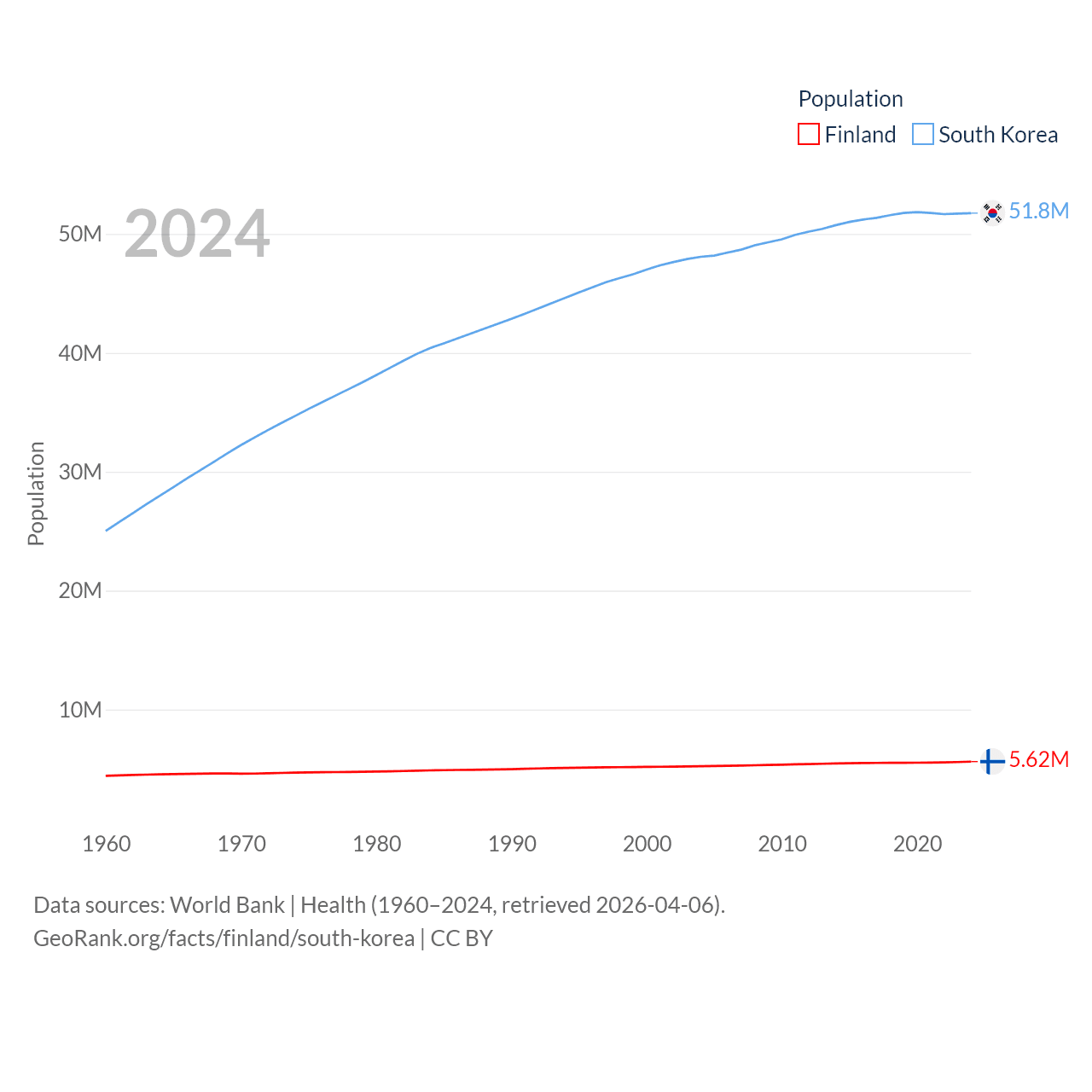 Finland has a population of 5.62M (ranked 116/197), compared with 51.8M in South Korea (ranked 29/197). Finland's land area is 117,360 sq mi versus 37,684 sq mi for South Korea (ranked 70th vs. 105th).