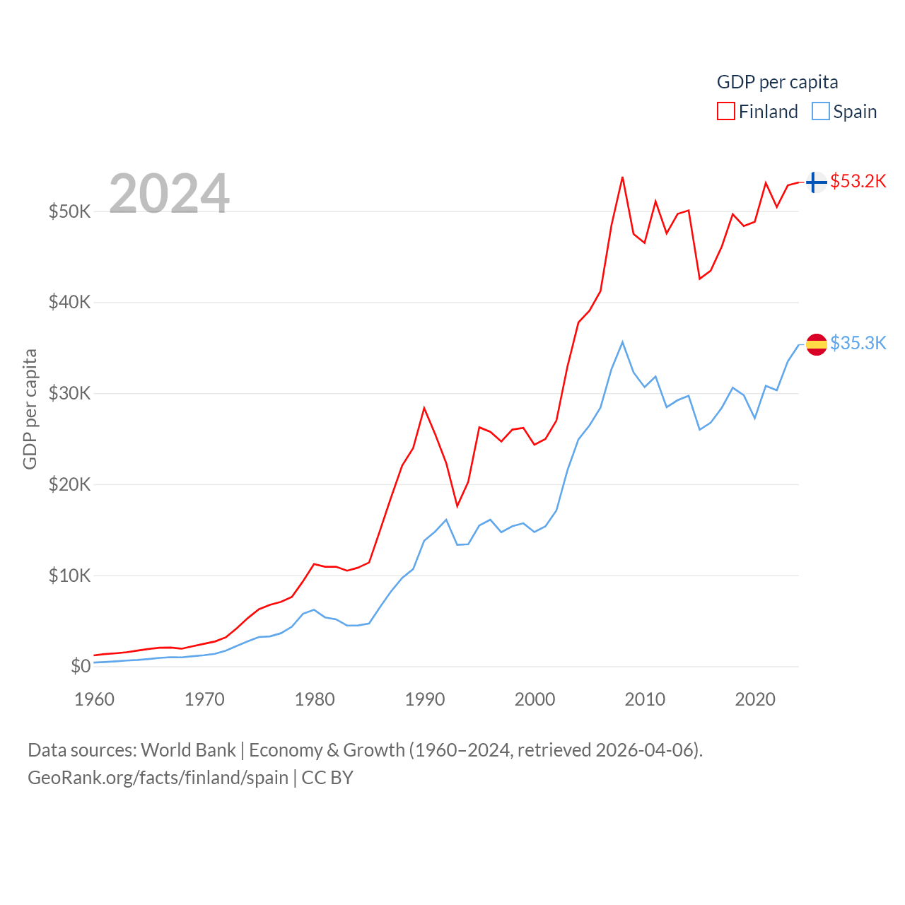 By GDP, Finland ranks 47/197 ($299B) and Spain ranks 15/197 ($1.73T). By GDP per capita, Finland ranks 23/197 ($53,150), while Spain ranks 32/197 ($35,327).