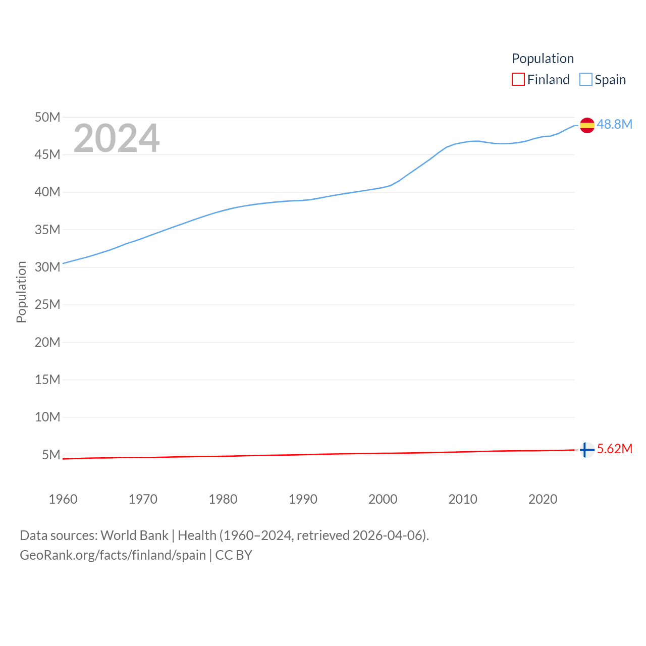 Finland has a population of 5.62M (ranked 116/197), compared with 48.8M in Spain (ranked 32/197). Finland's land area is 117,360 sq mi versus 192,934 sq mi for Spain (ranked 70th vs. 51st).