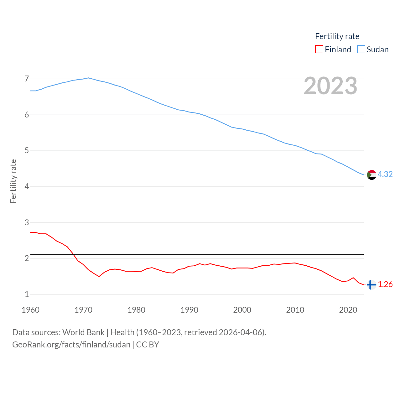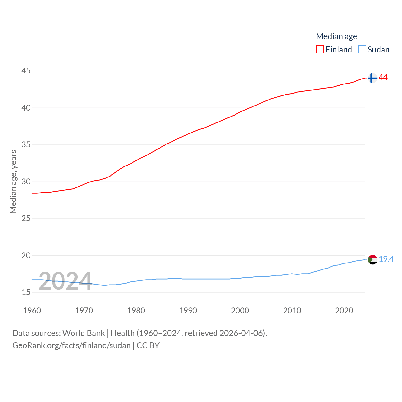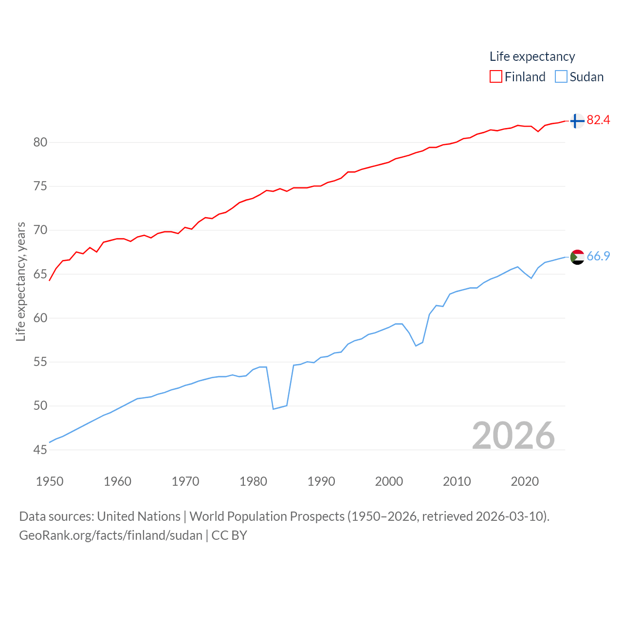 Finland has a population of 5.62M (ranked 116/197), compared with 50.4M in Sudan (ranked 30/197). Finland's land area is 117,360 sq mi versus 721,239 sq mi for Sudan (ranked 70th vs. 15th).