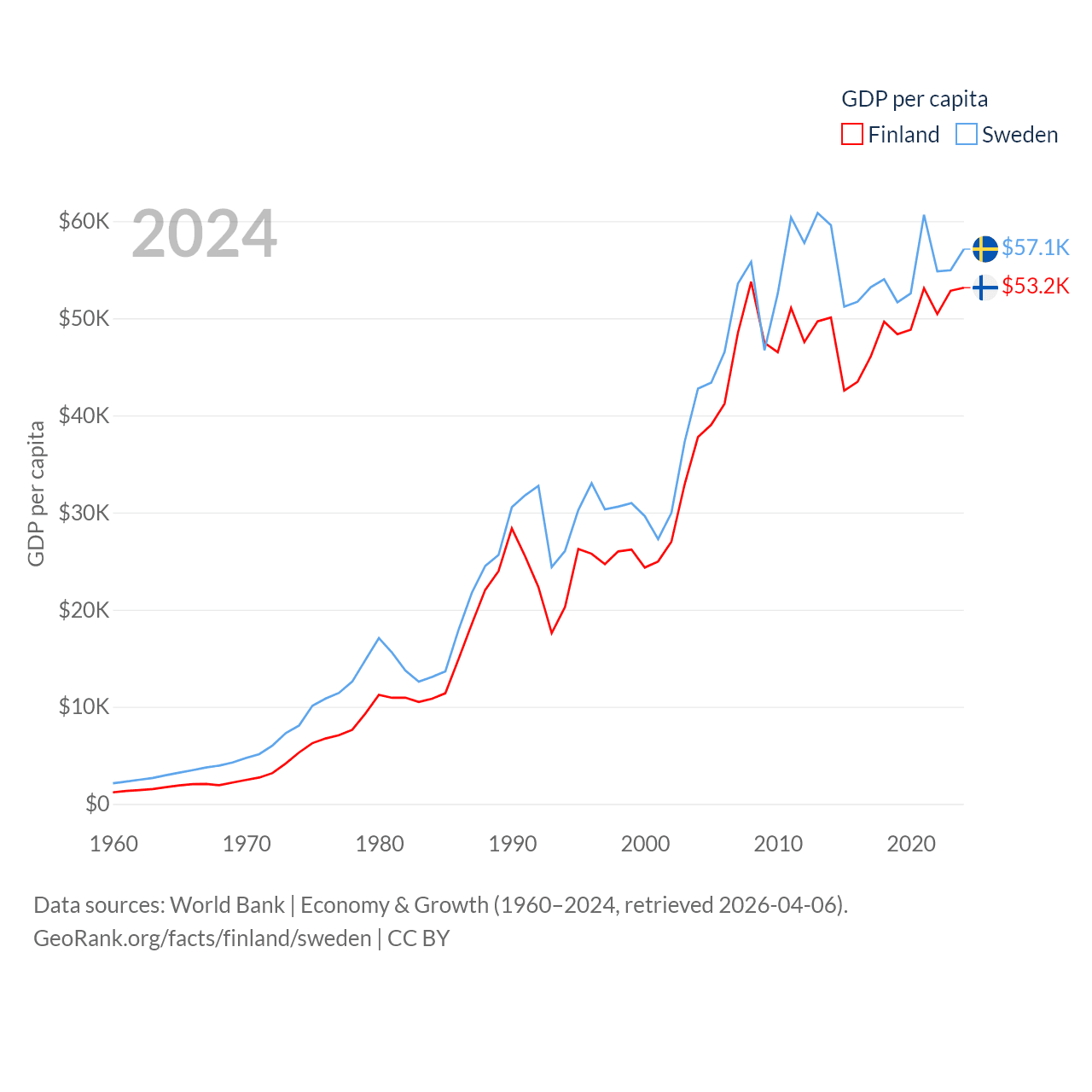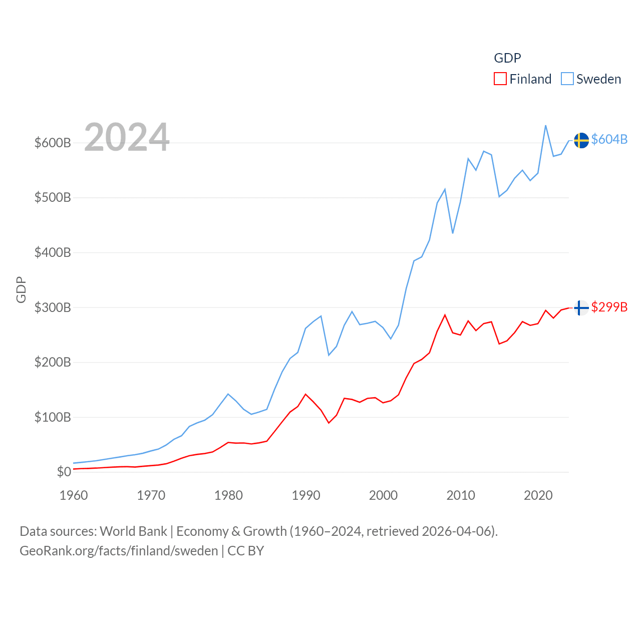 By GDP, Finland ranks 47/197 ($299B) and Sweden ranks 26/197 ($604B). By GDP per capita, Finland ranks 23/197 ($53,150), while Sweden ranks 17/197 ($57,117).