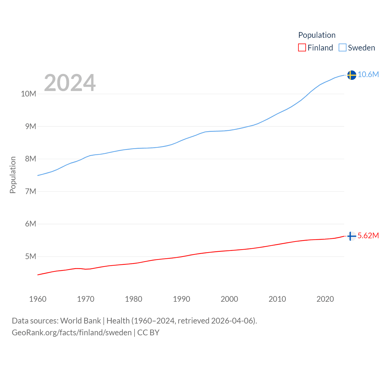 Finland has a population of 5.62M (ranked 116/197), compared with 10.6M in Sweden (ranked 93/197). Finland's land area is 117,360 sq mi versus 157,248 sq mi for Sweden (ranked 70th vs. 58th).