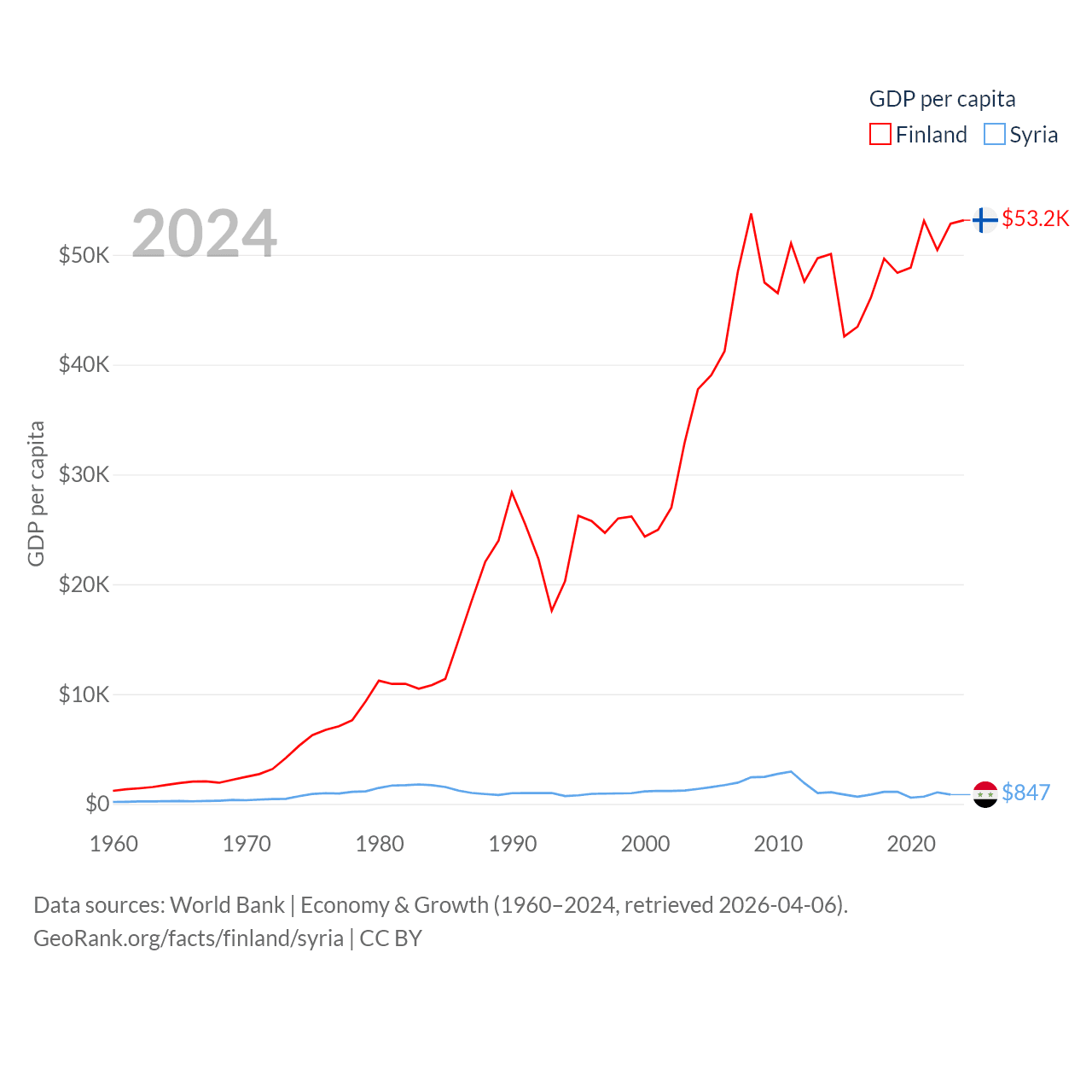 By GDP, Finland ranks 47/197 ($299B) and Syria ranks 129/197 ($20B). By GDP per capita, Finland ranks 23/197 ($53,150), while Syria ranks 185/197 ($847).