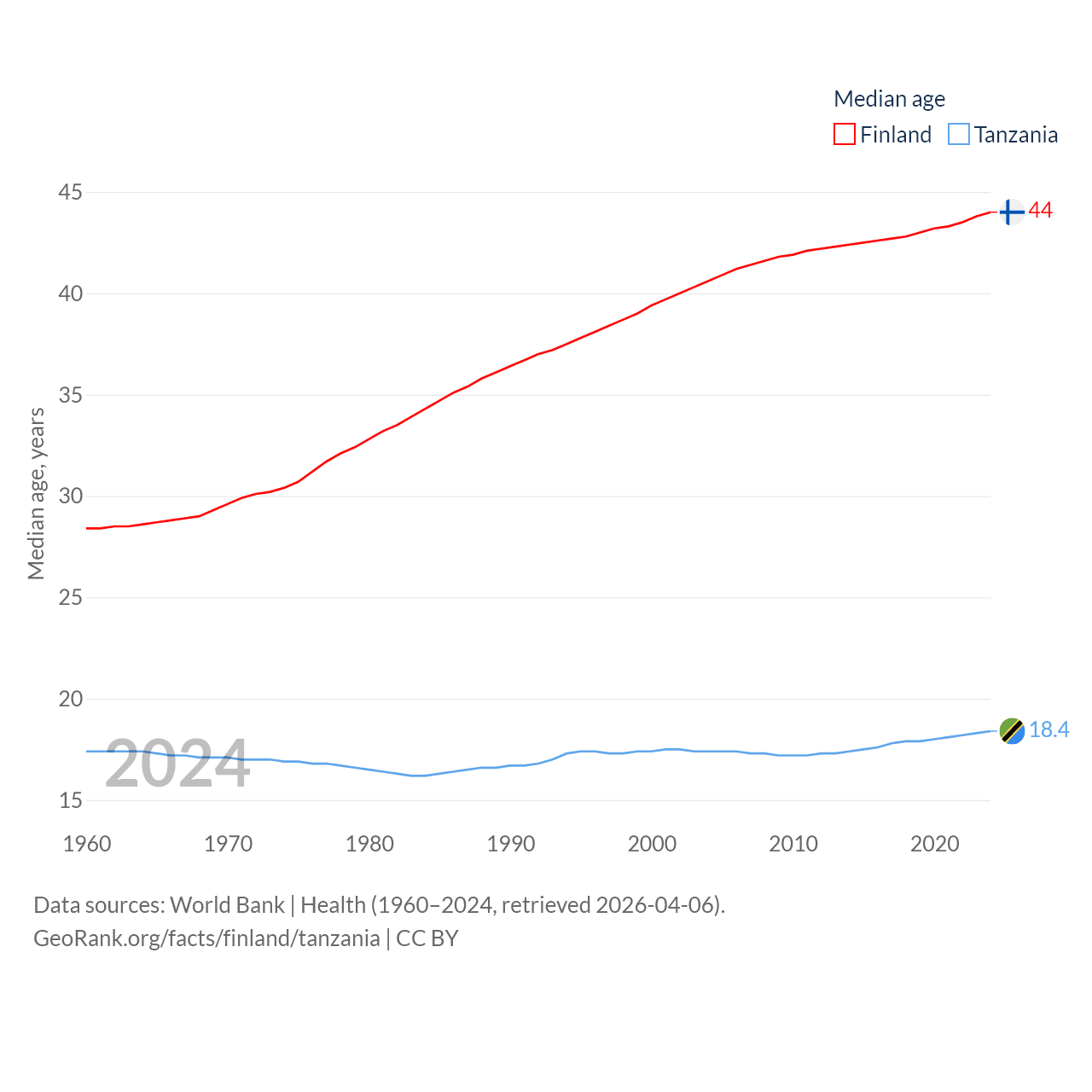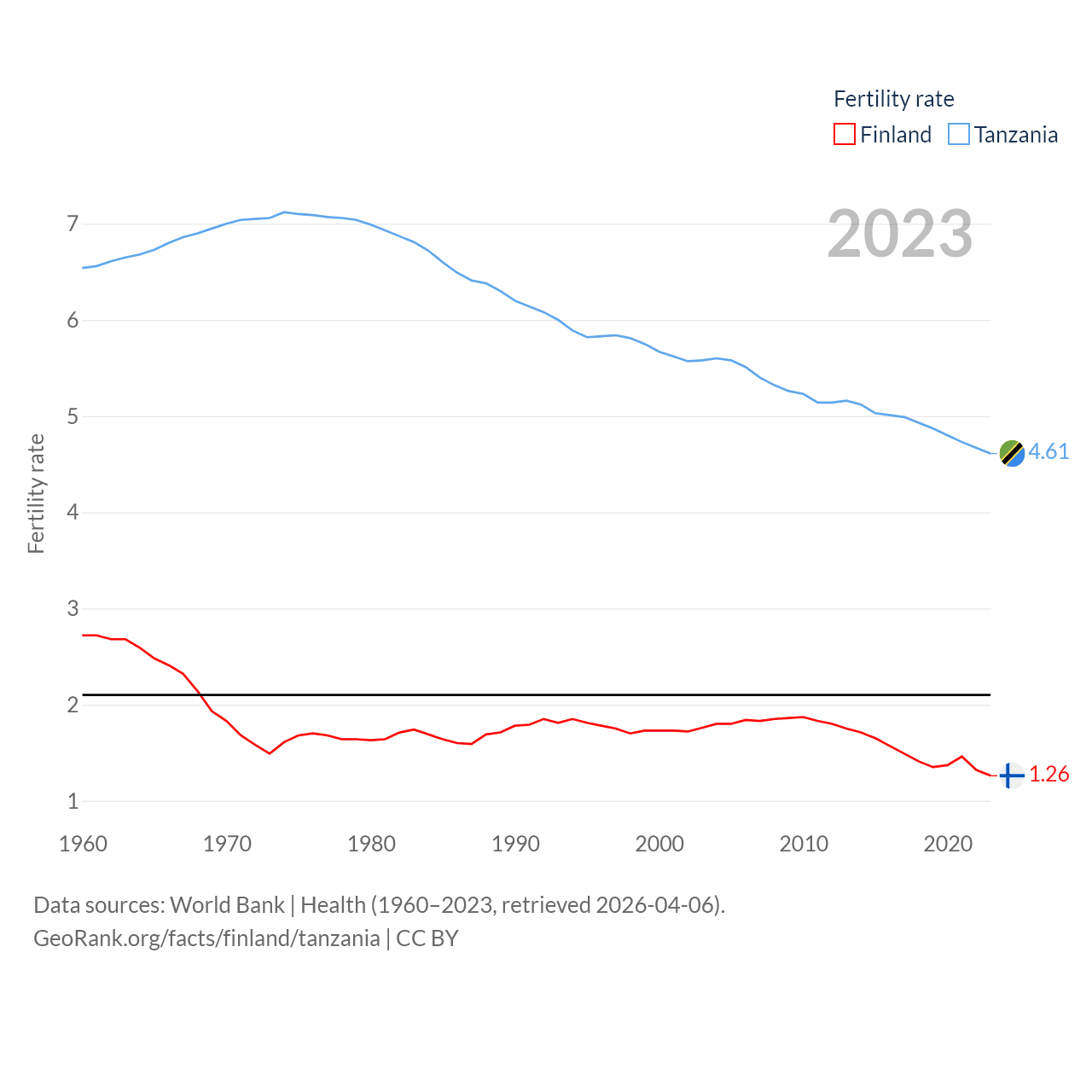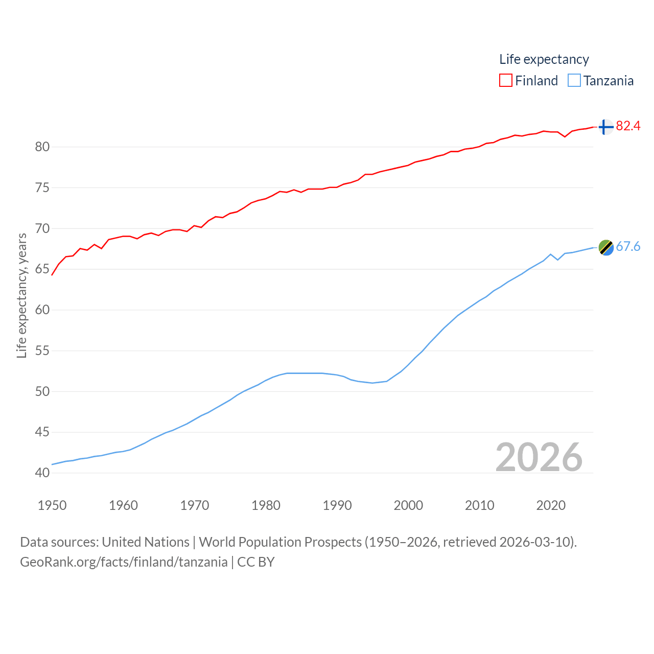 Finland has a population of 5.62M (ranked 116/197), compared with 68.6M in Tanzania (ranked 22/197). Finland's land area is 117,360 sq mi versus 342,009 sq mi for Tanzania (ranked 70th vs. 31st).