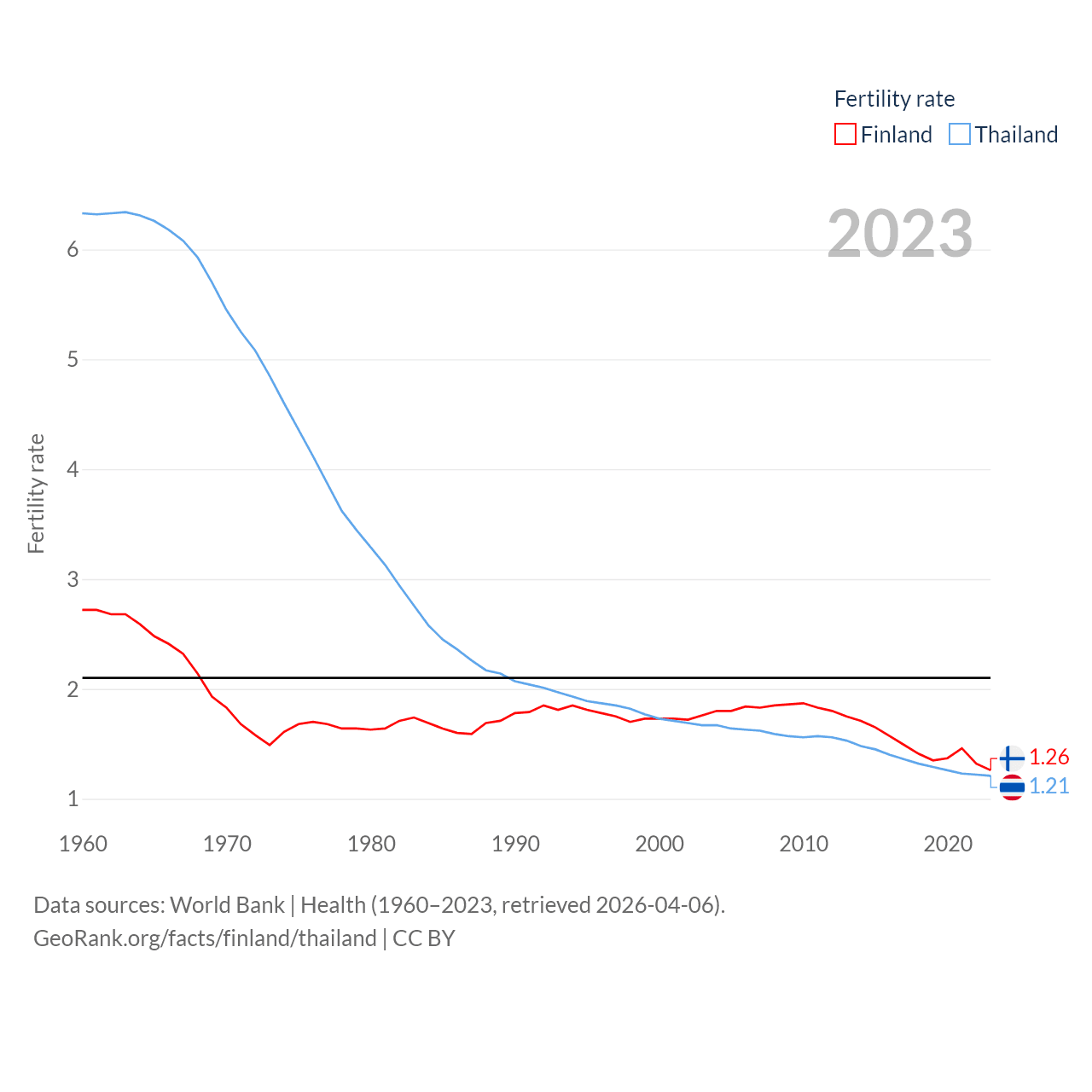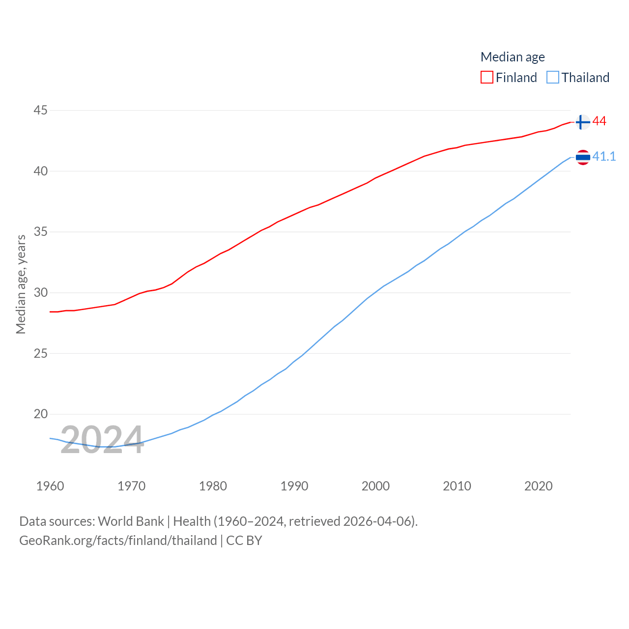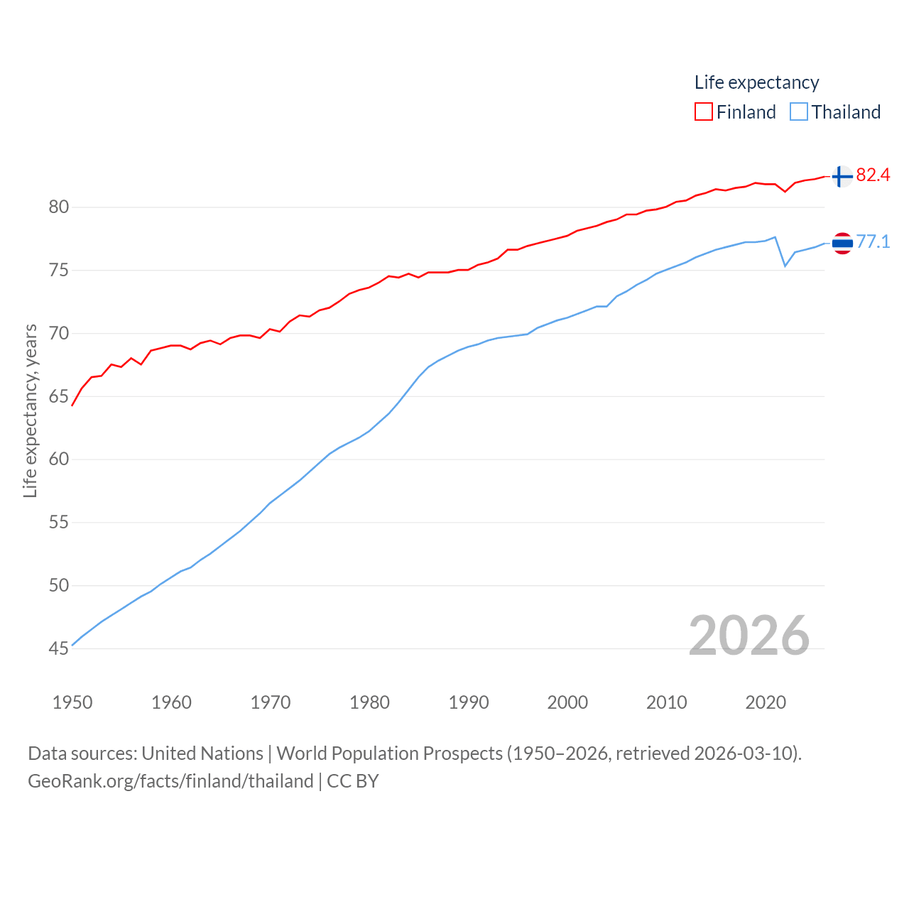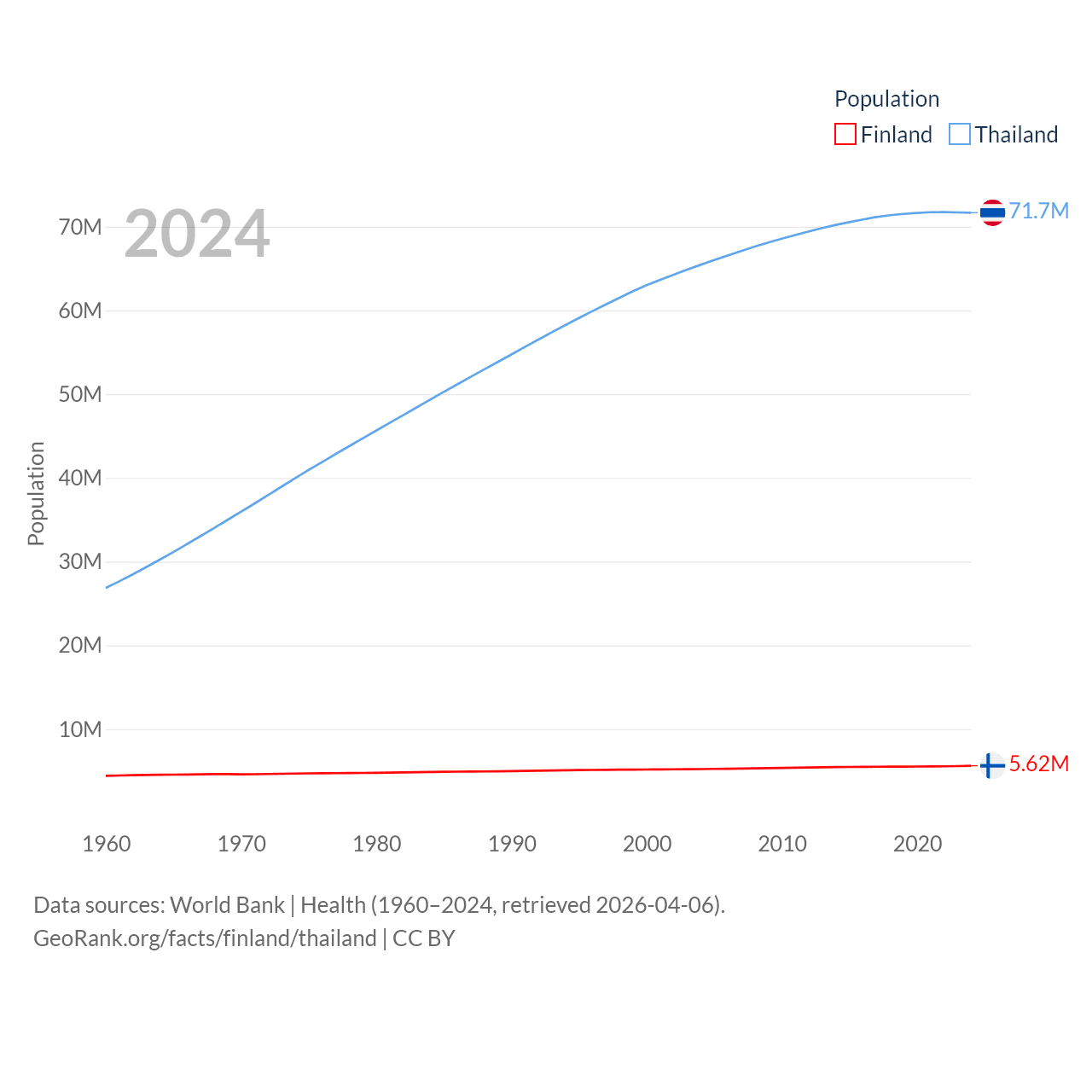 Finland has a population of 5.62M (ranked 116/197), compared with 71.7M in Thailand (ranked 20/197). Finland's land area is 117,360 sq mi versus 197,256 sq mi for Thailand (ranked 70th vs. 50th).