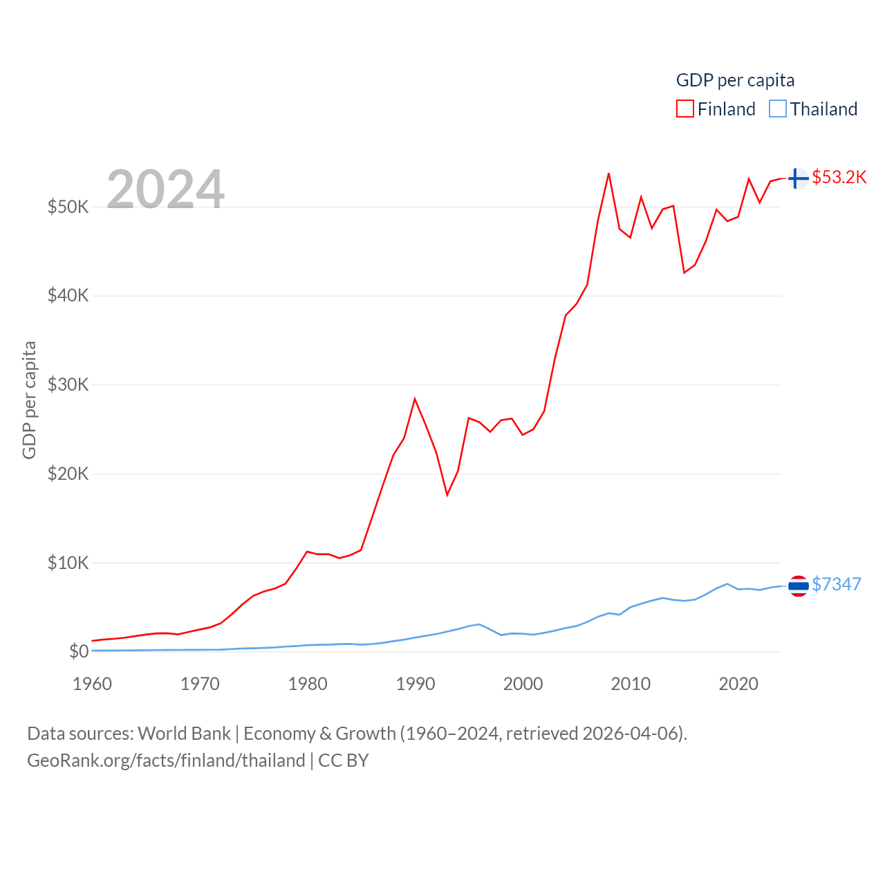 By GDP, Finland ranks 47/197 ($299B) and Thailand ranks 31/197 ($527B). By GDP per capita, Finland ranks 23/197 ($53,150), while Thailand ranks 100/197 ($7,347).