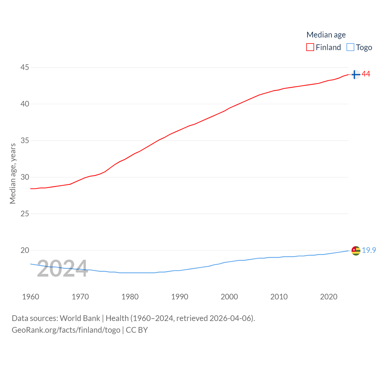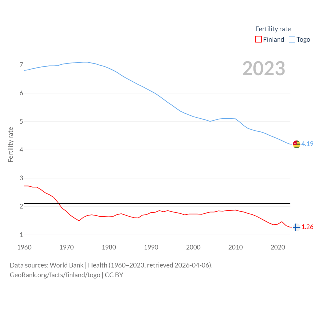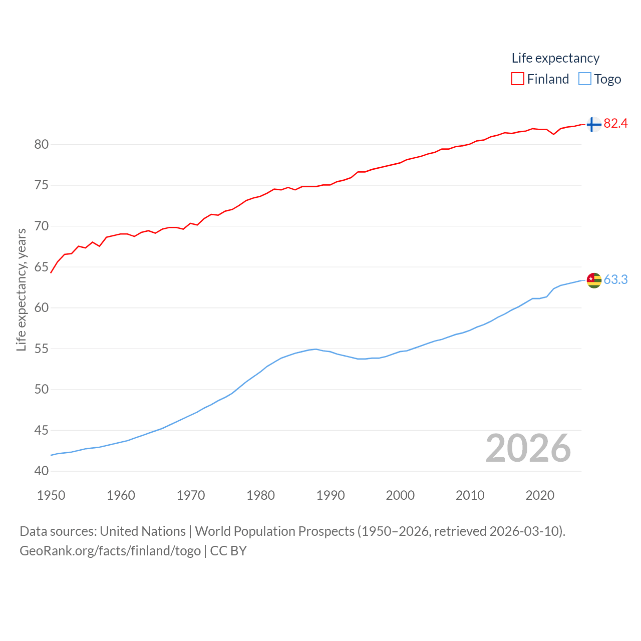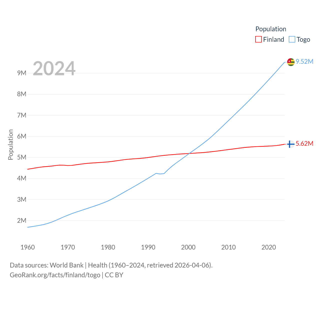 Finland has a population of 5.62M (ranked 116/197), compared with 9.52M in Togo (ranked 98/197). Finland's land area is 117,360 sq mi versus 21,000 sq mi for Togo (ranked 70th vs. 124th).