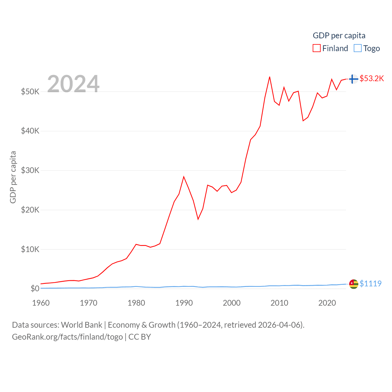 By GDP, Finland ranks 47/197 ($299B) and Togo ranks 154/197 ($10.7B). By GDP per capita, Finland ranks 23/197 ($53,150), while Togo ranks 172/197 ($1,119).