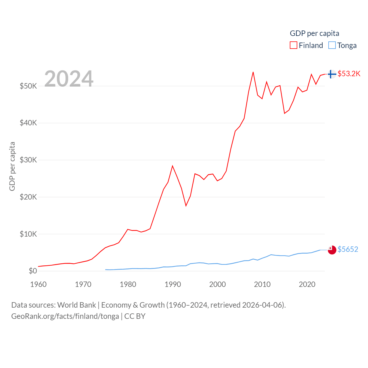 By GDP, Finland ranks 47/197 ($299B) and Tonga ranks 191/197 ($591M). By GDP per capita, Finland ranks 23/197 ($53,150), while Tonga ranks 115/197 ($5,652).