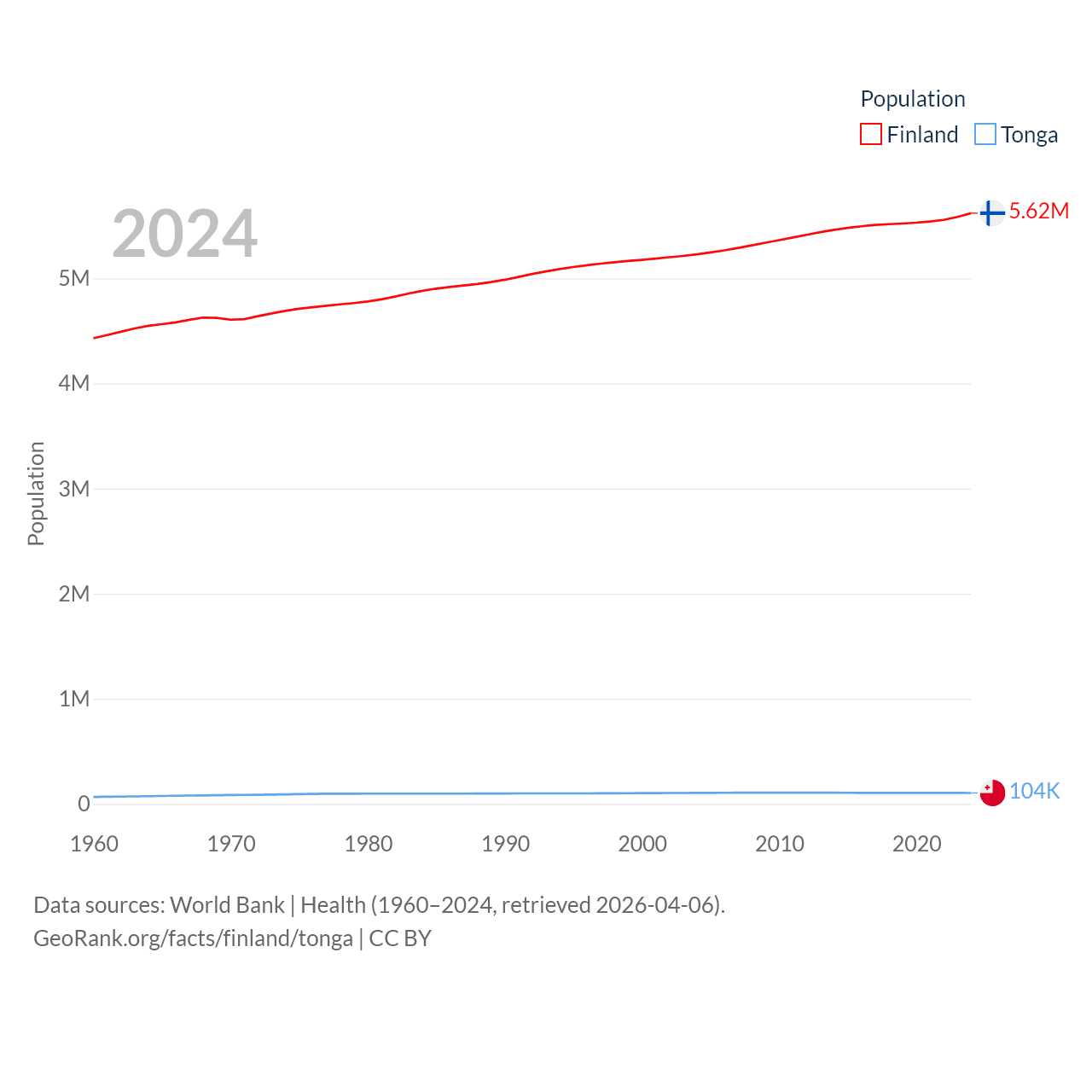 Finland has a population of 5.62M (ranked 116/197), compared with 104K in Tonga (ranked 183/197). Finland's land area is 117,360 sq mi versus 278 sq mi for Tonga (ranked 70th vs. 176th).