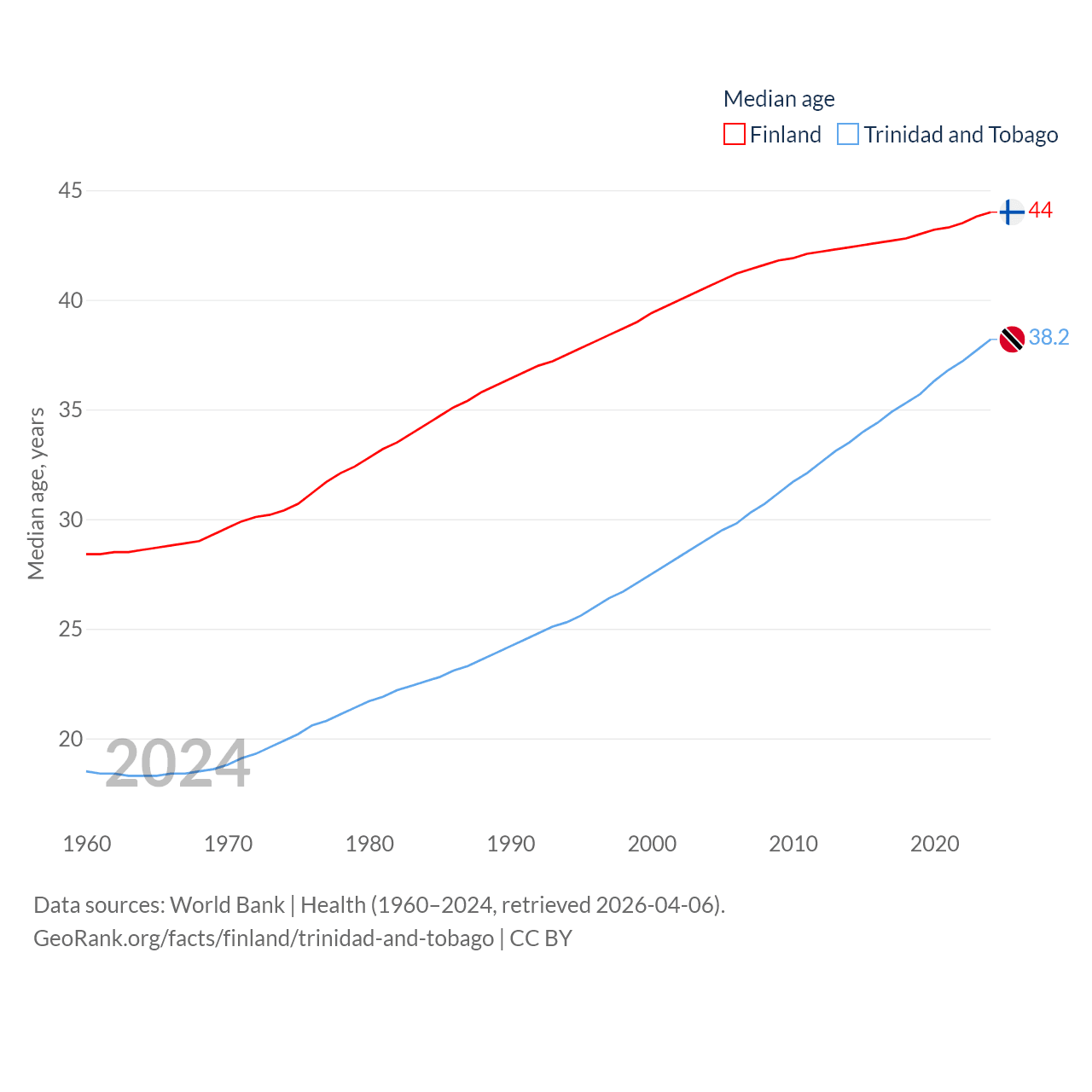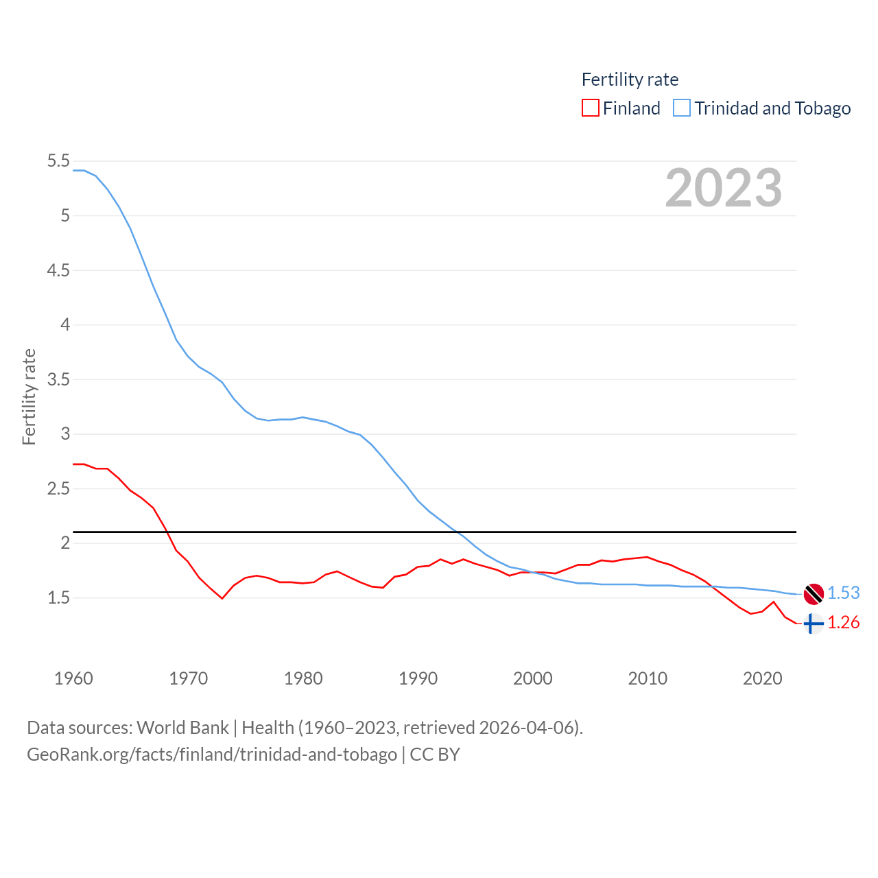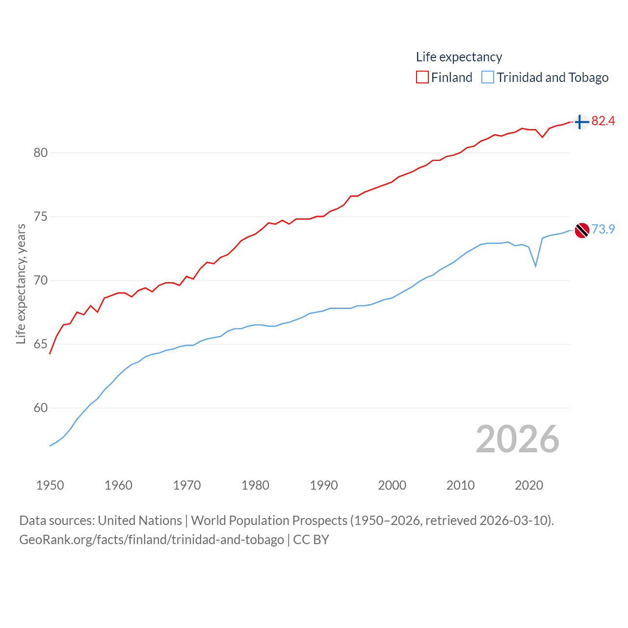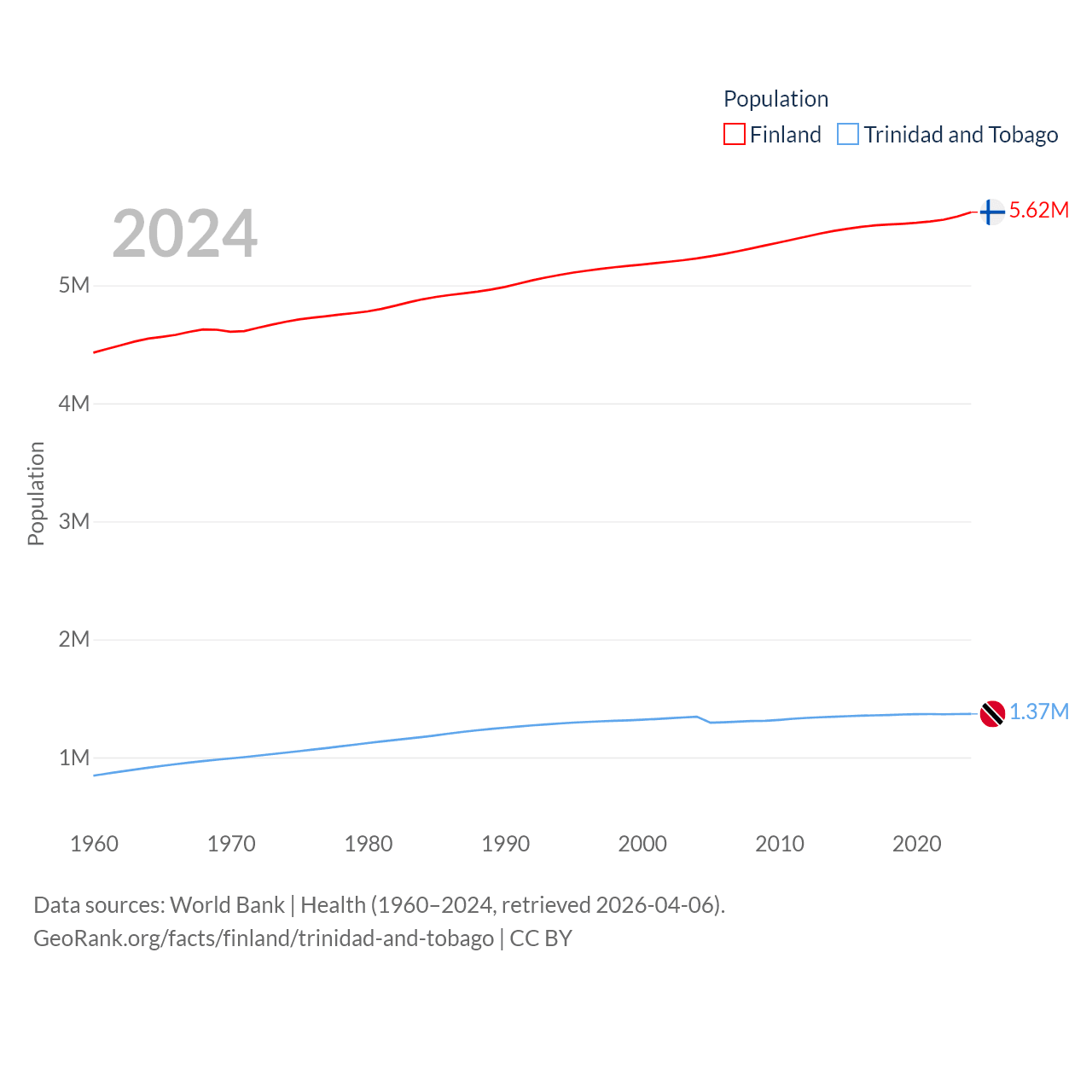 Finland has a population of 5.62M (ranked 116/197), compared with 1.37M in Trinidad and Tobago (ranked 154/197). Finland's land area is 117,360 sq mi versus 1,981 sq mi for Trinidad and Tobago (ranked 70th vs. 166th).