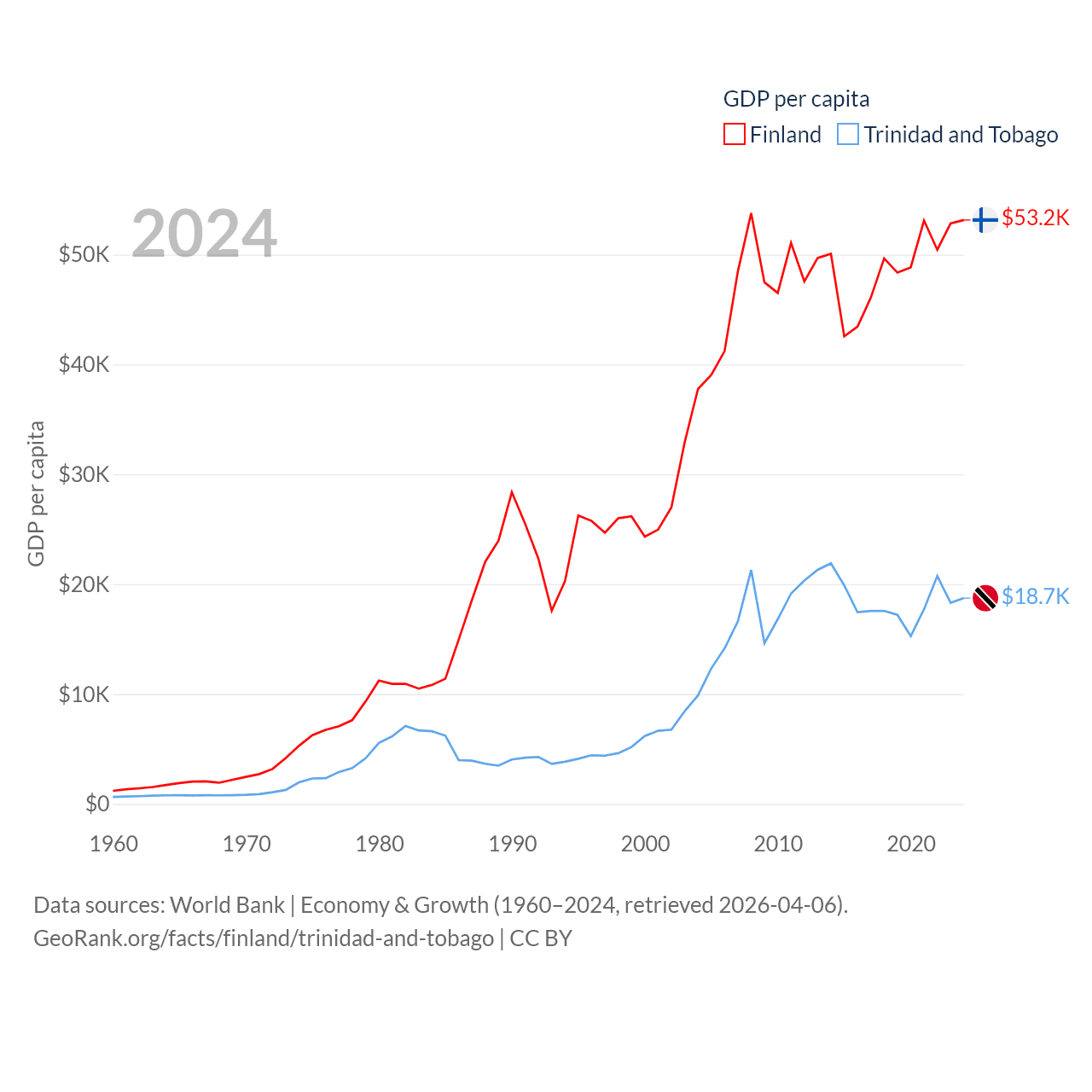 By GDP, Finland ranks 47/197 ($299B) and Trinidad and Tobago ranks 115/197 ($25.6B). By GDP per capita, Finland ranks 23/197 ($53,150), while Trinidad and Tobago ranks 61/197 ($18,733).