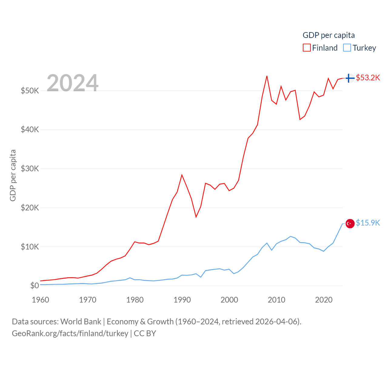 By GDP, Finland ranks 47/197 ($299B) and Turkey ranks 17/197 ($1.36T). By GDP per capita, Finland ranks 23/197 ($53,150), while Turkey ranks 66/197 ($15,893).