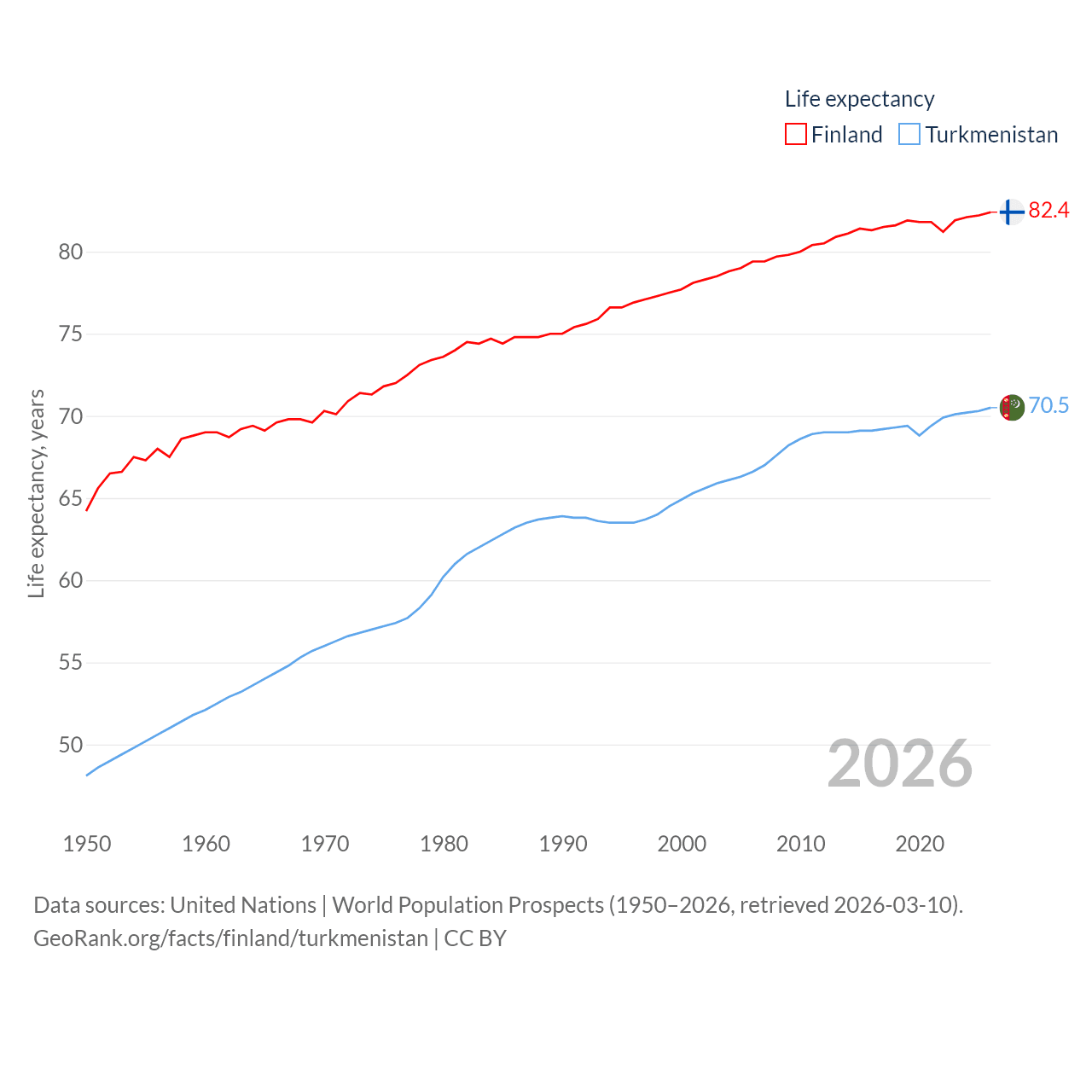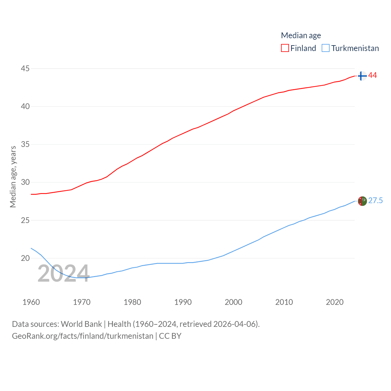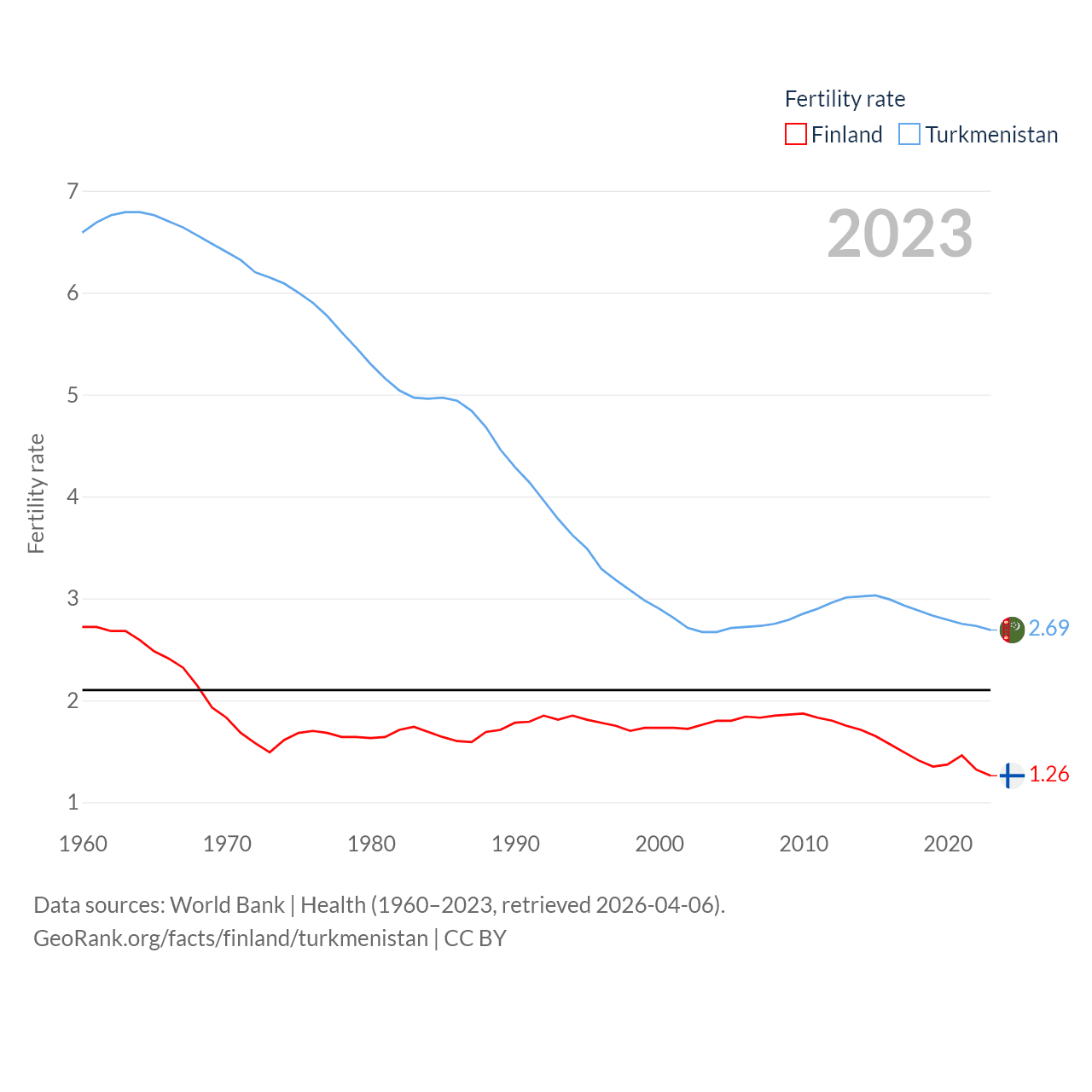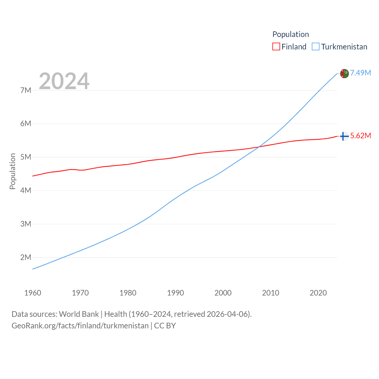 Finland has a population of 5.62M (ranked 116/197), compared with 7.49M in Turkmenistan (ranked 104/197). Finland's land area is 117,360 sq mi versus 181,441 sq mi for Turkmenistan (ranked 70th vs. 53rd).