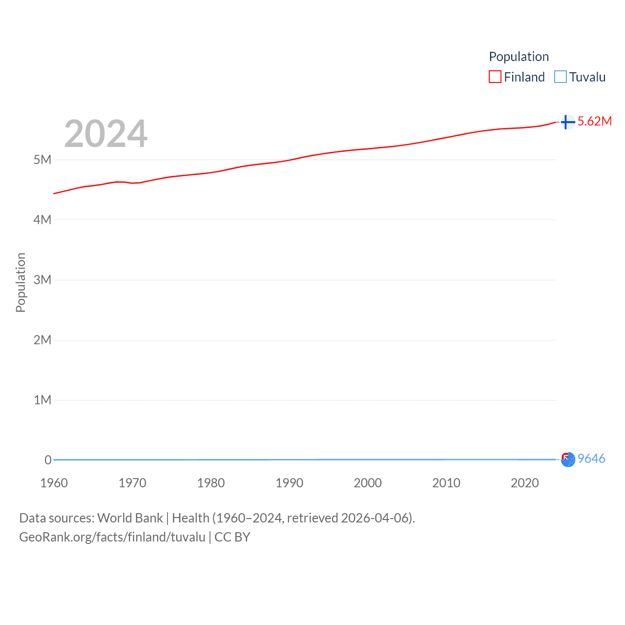 Finland has a population of 5.62M (ranked 116/197), compared with 9.65K in Tuvalu (ranked 196/197). Finland's land area is 117,360 sq mi versus 11.6 sq mi for Tuvalu (ranked 70th vs. 194th).