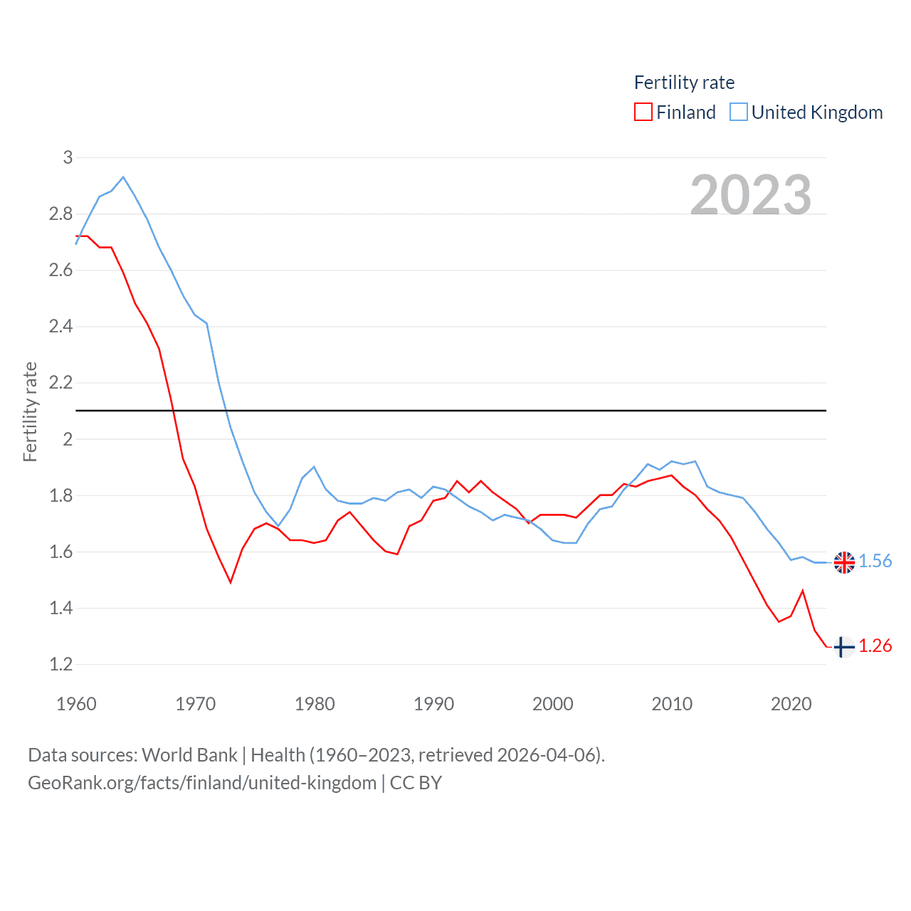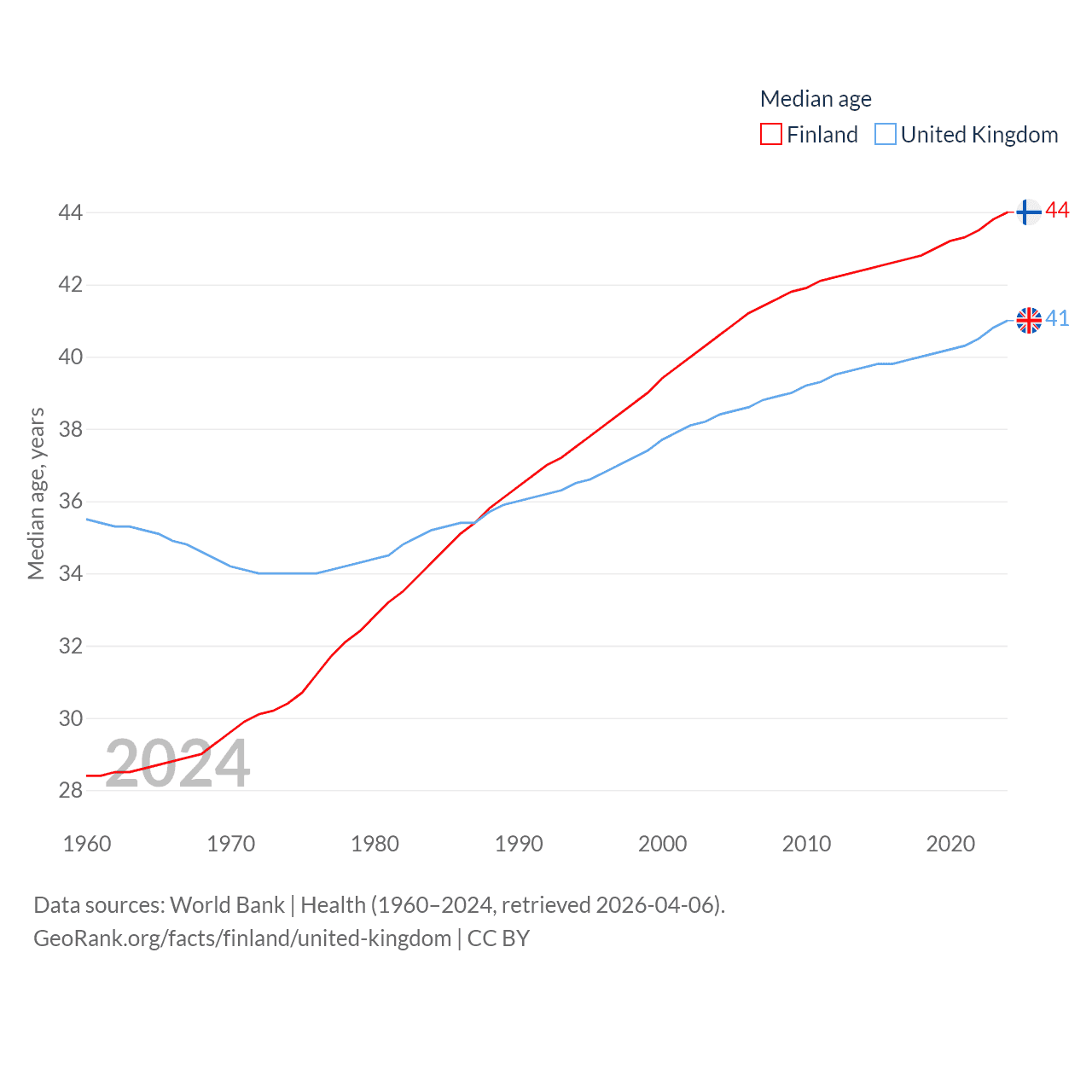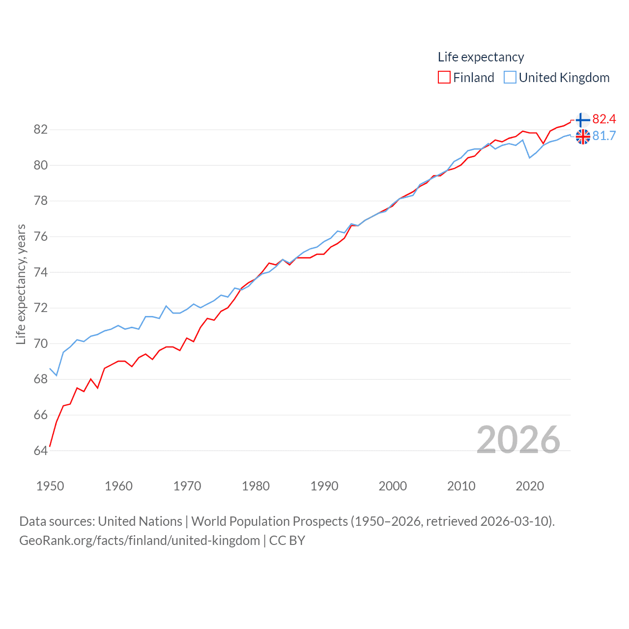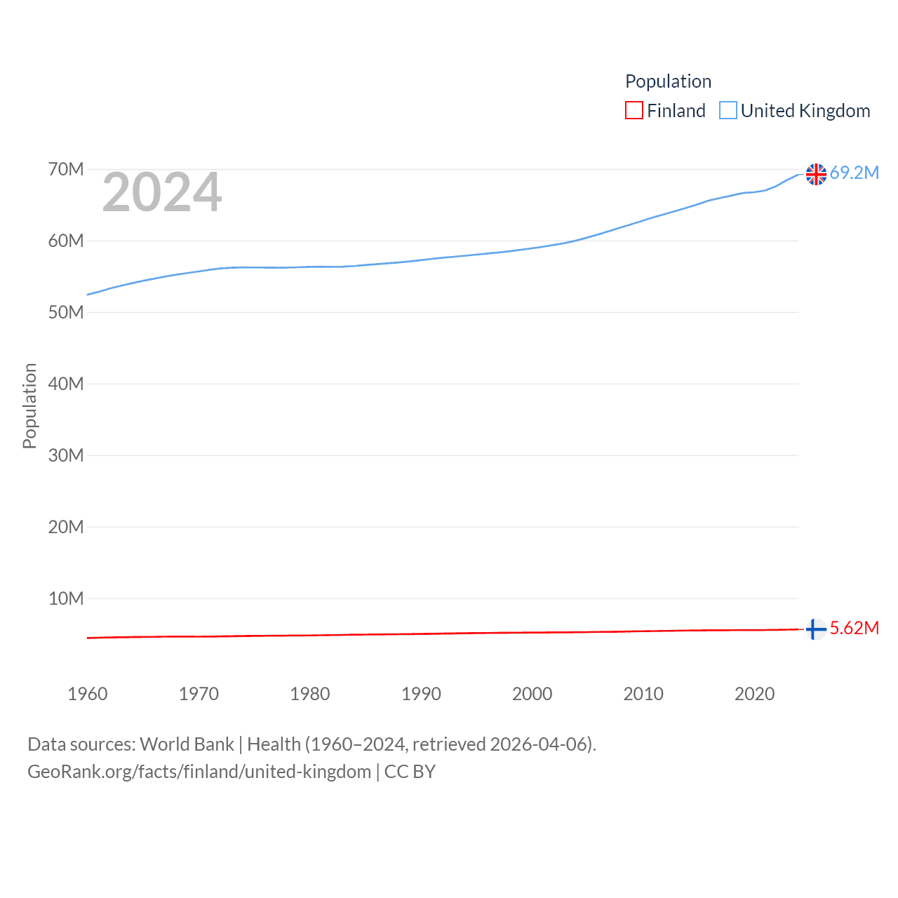 Finland has a population of 5.62M (ranked 116/197), compared with 69.2M in The United Kingdom (ranked 21/197). Finland's land area is 117,360 sq mi versus 93,410 sq mi for The United Kingdom (ranked 70th vs. 78th).