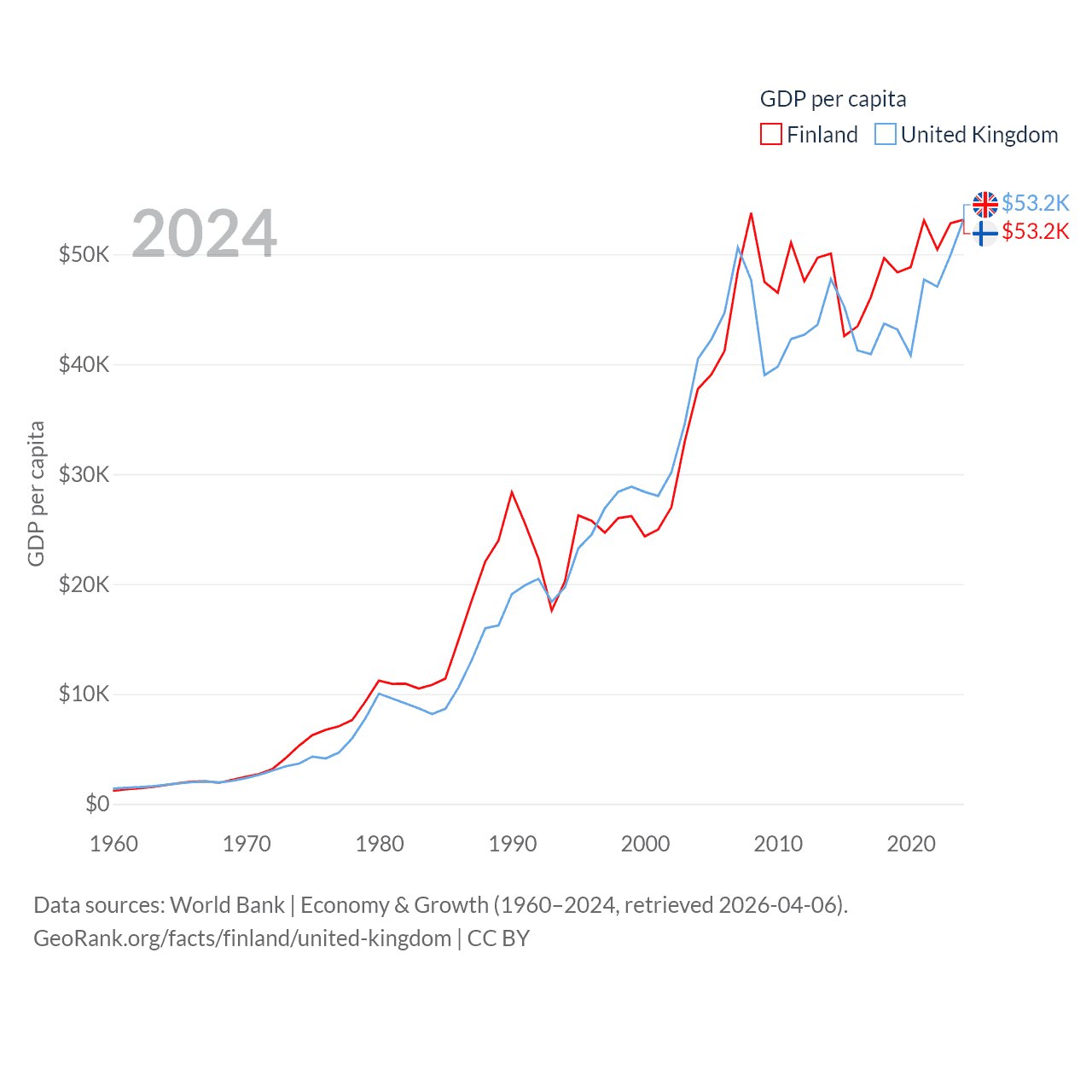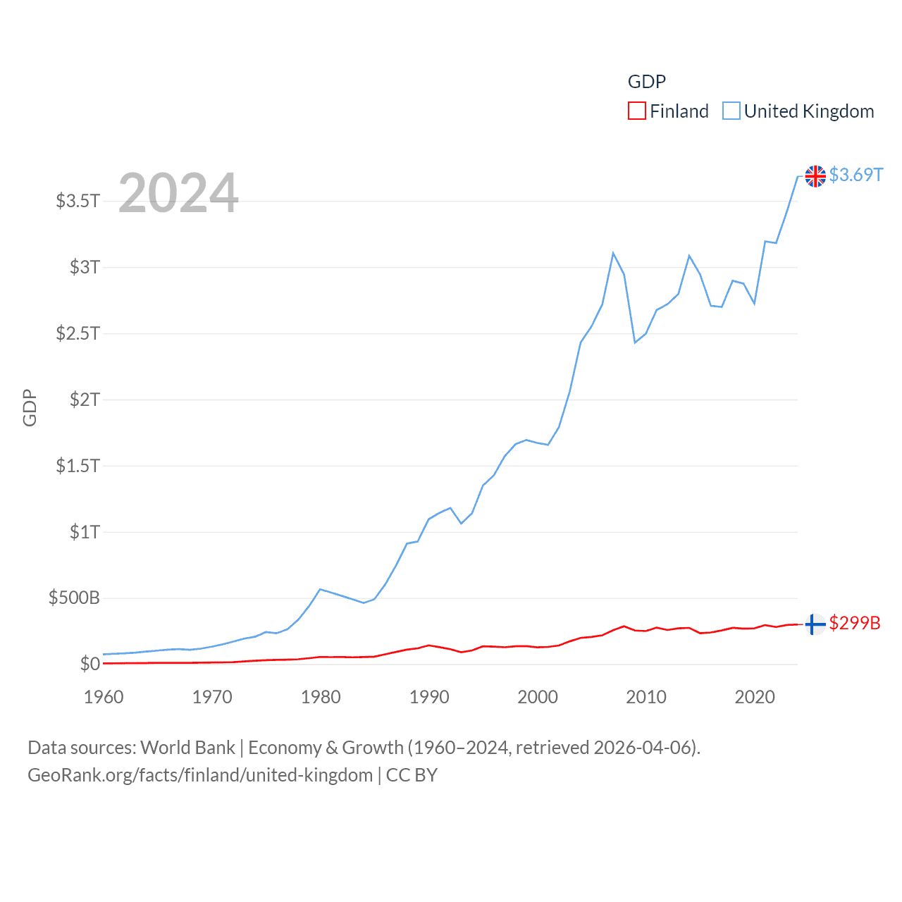 By GDP, Finland ranks 47/197 ($299B) and The United Kingdom ranks 6/197 ($3.69T). By GDP per capita, Finland ranks 23/197 ($53,150), while The United Kingdom ranks 22/197 ($53,246).