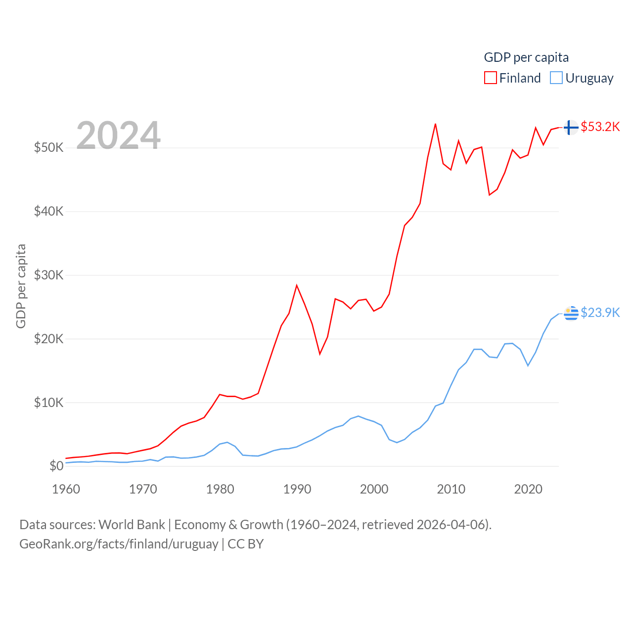 By GDP, Finland ranks 47/197 ($299B) and Uruguay ranks 81/197 ($81B). By GDP per capita, Finland ranks 23/197 ($53,150), while Uruguay ranks 52/197 ($23,907).