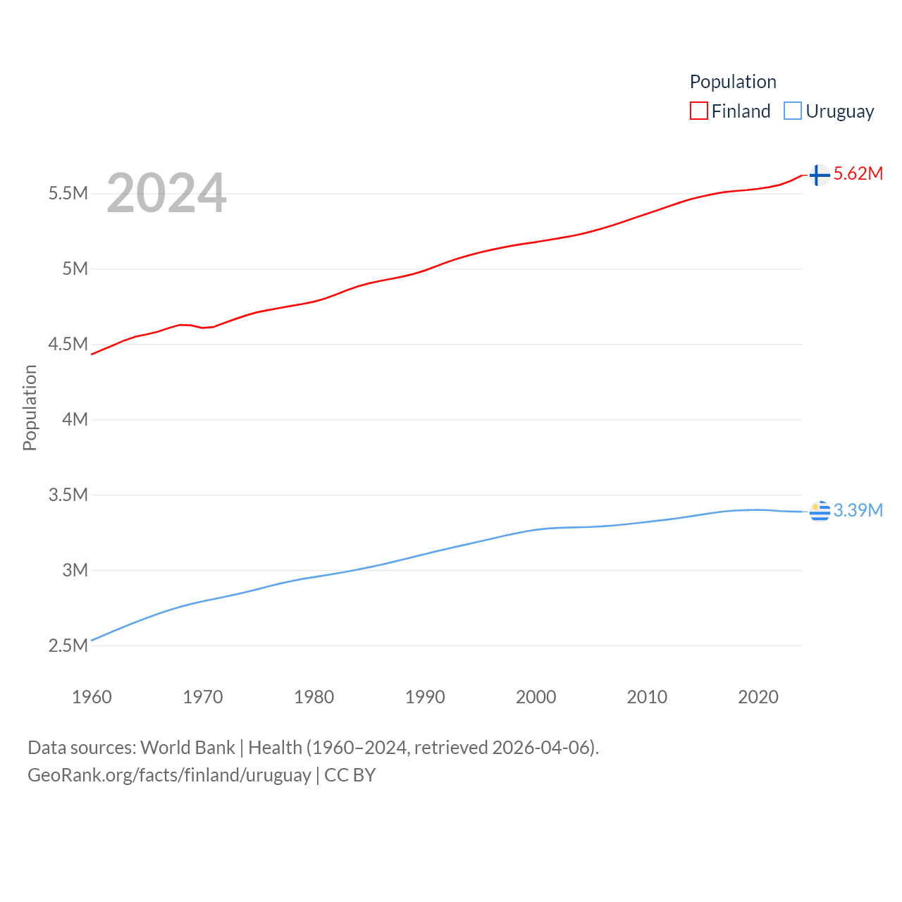 Finland has a population of 5.62M (ranked 116/197), compared with 3.39M in Uruguay (ranked 133/197). Finland's land area is 117,360 sq mi versus 67,576 sq mi for Uruguay (ranked 70th vs. 89th).