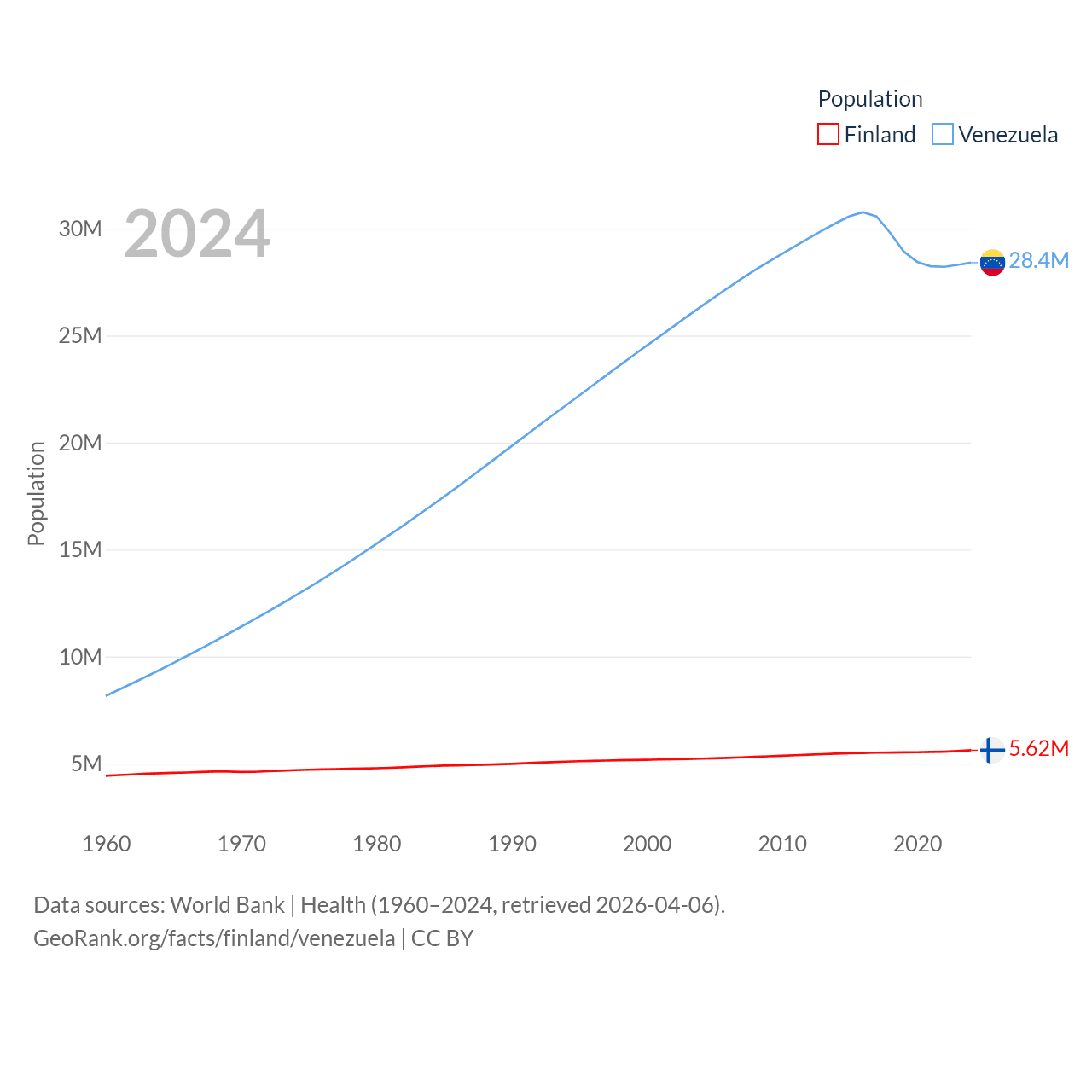 Finland has a population of 5.62M (ranked 116/197), compared with 28.4M in Venezuela (ranked 53/197). Finland's land area is 117,360 sq mi versus 340,561 sq mi for Venezuela (ranked 70th vs. 32nd).