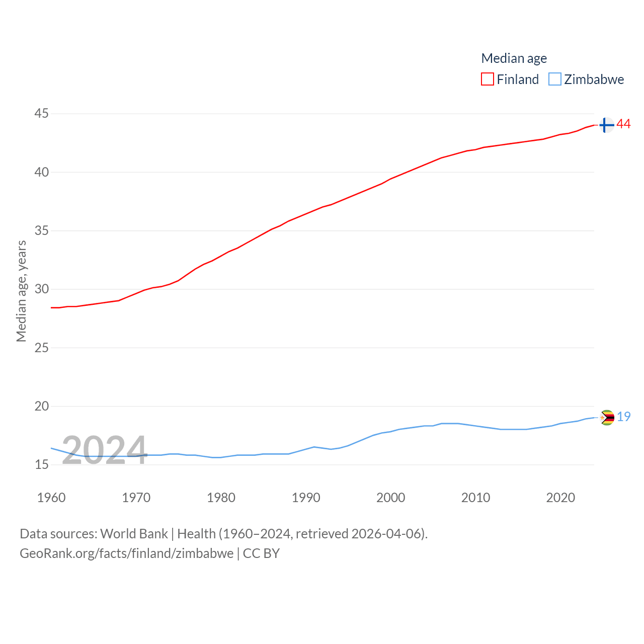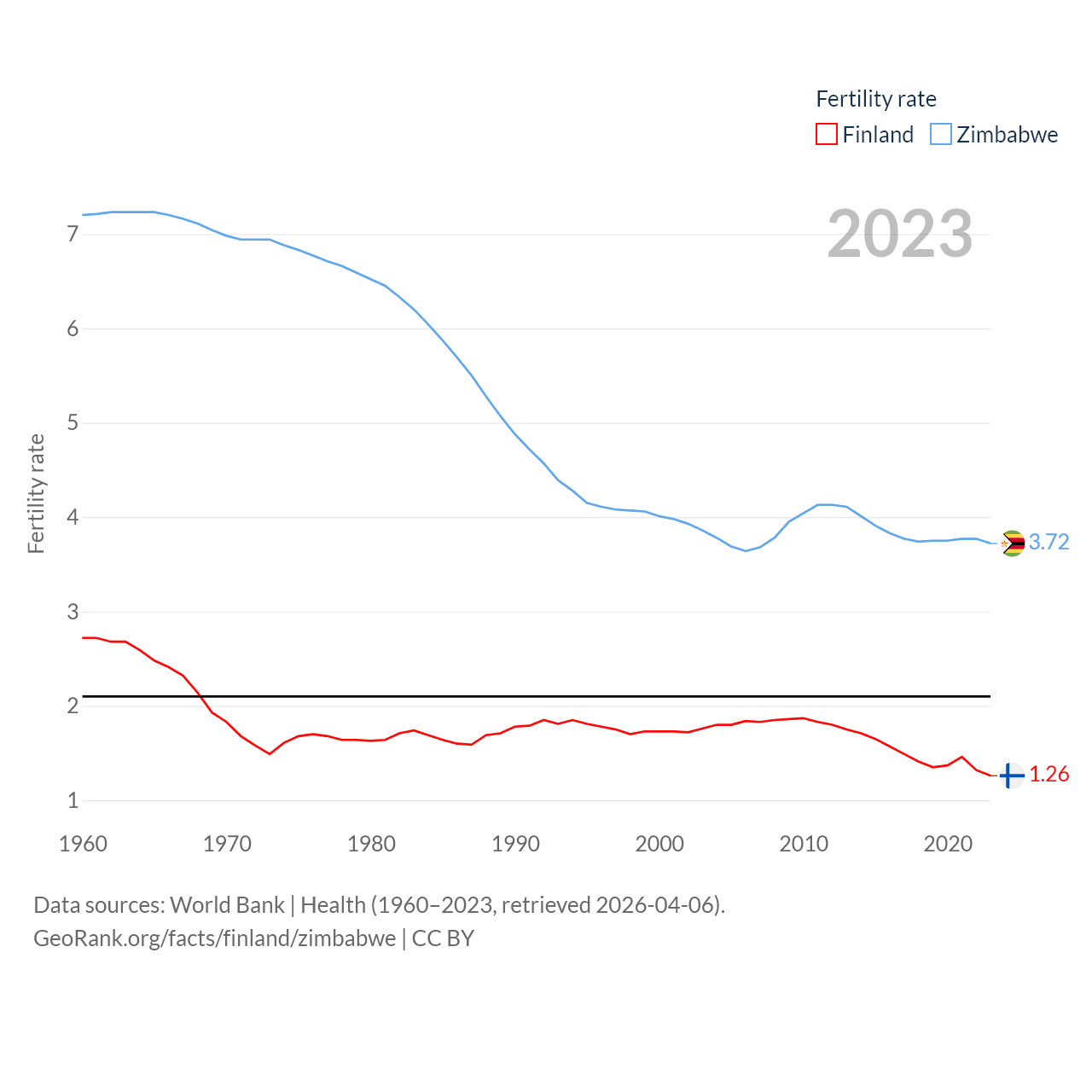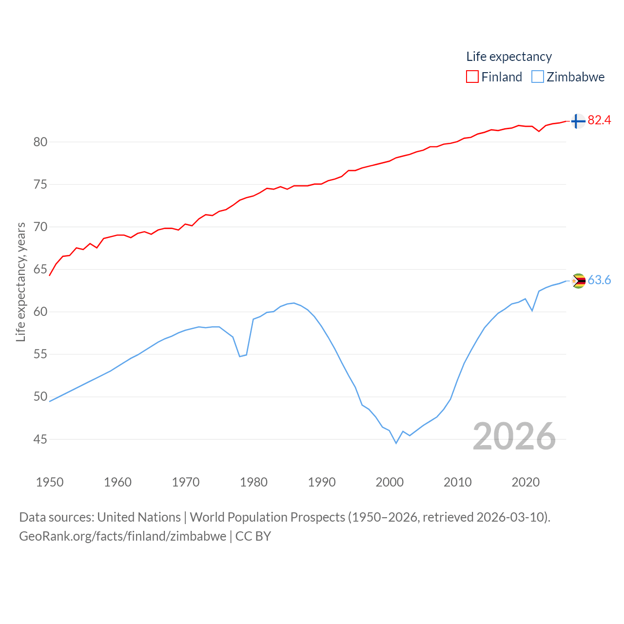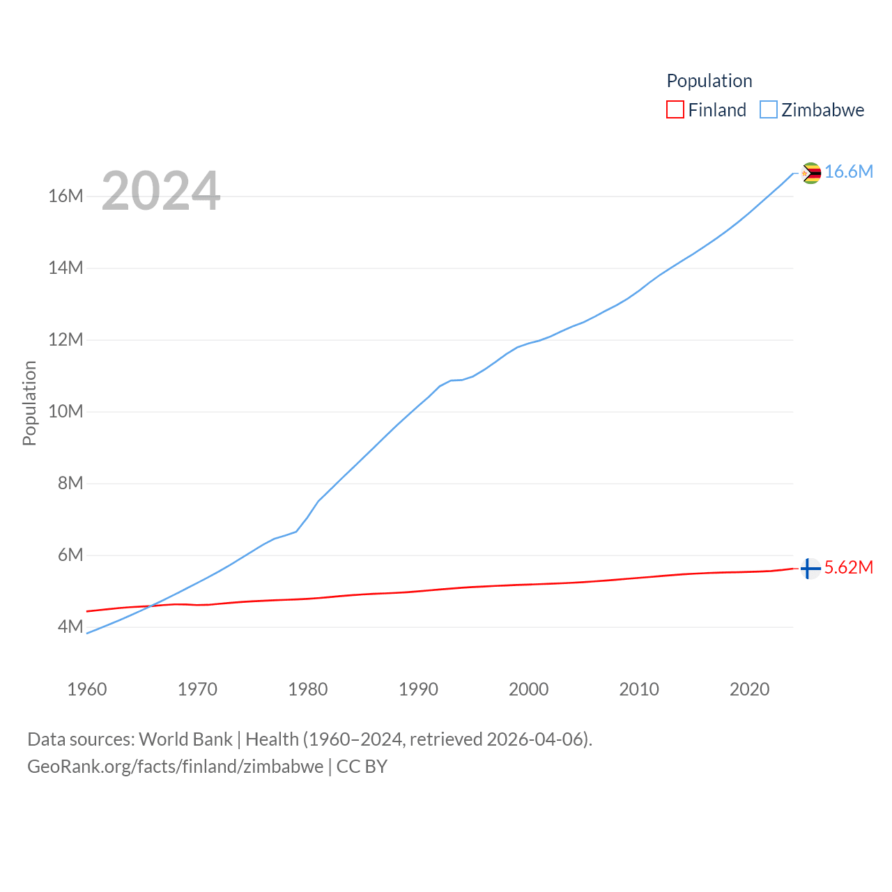 Finland has a population of 5.62M (ranked 116/197), compared with 16.6M in Zimbabwe (ranked 74/197). Finland's land area is 117,360 sq mi versus 149,364 sq mi for Zimbabwe (ranked 70th vs. 60th).