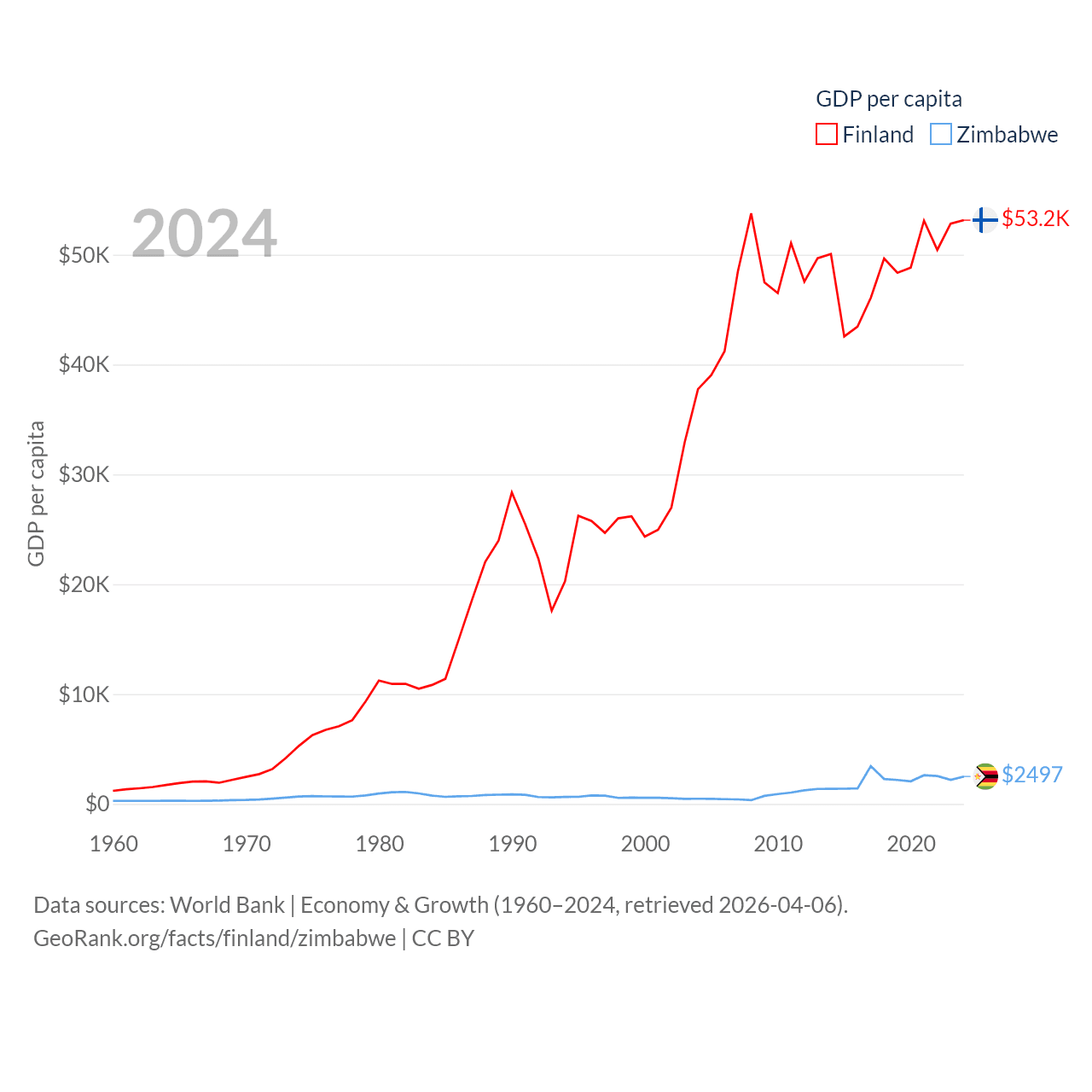 By GDP, Finland ranks 47/197 ($299B) and Zimbabwe ranks 102/197 ($41.5B). By GDP per capita, Finland ranks 23/197 ($53,150), while Zimbabwe ranks 148/197 ($2,497).