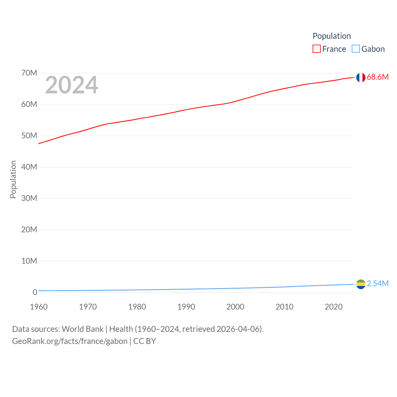France has a population of 68.6M (ranked 23/197), compared with 2.54M in Gabon (ranked 141/197). France's land area is 208,090 sq mi versus 99,487 sq mi for Gabon (ranked 48th vs. 75th).