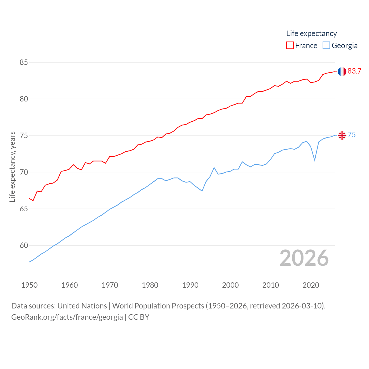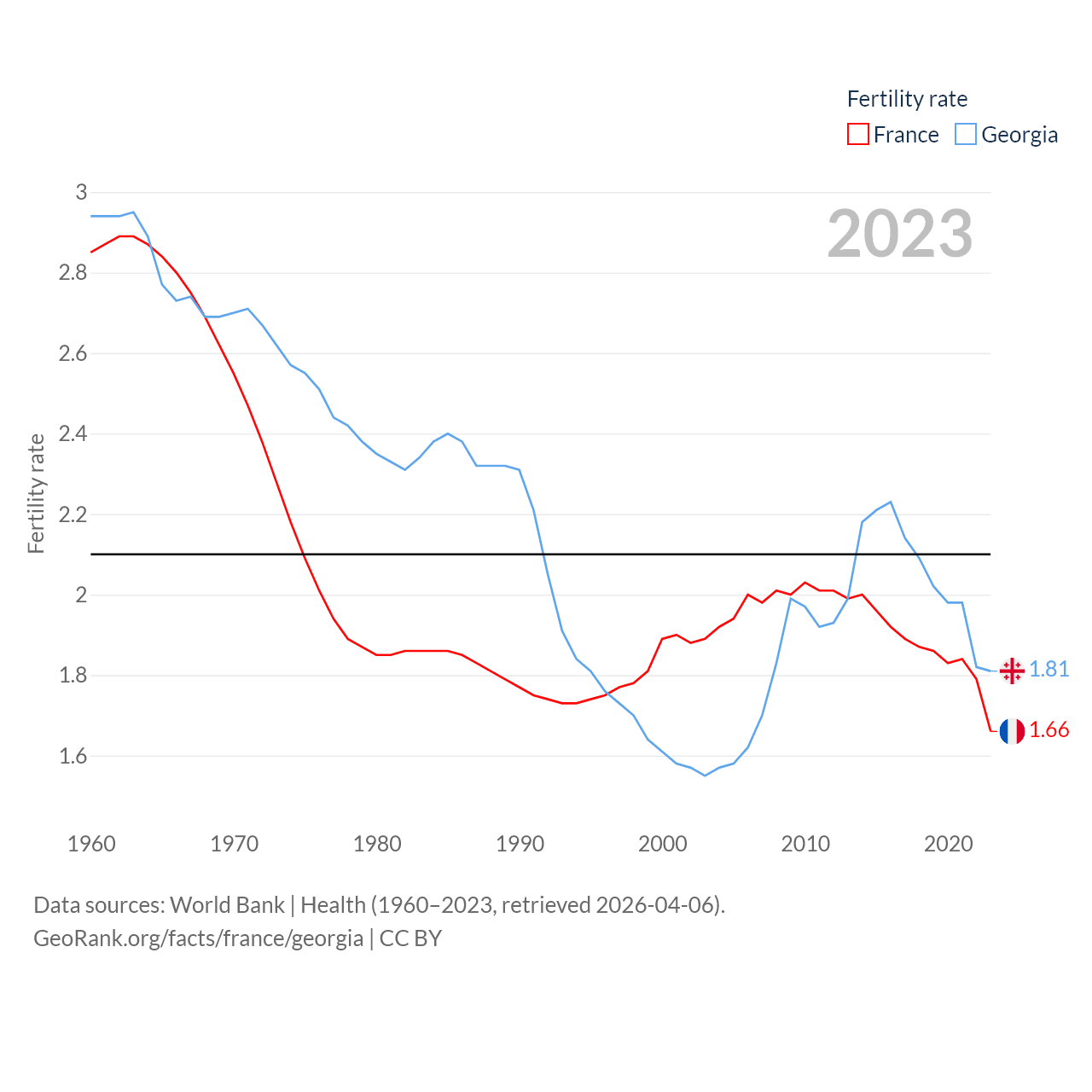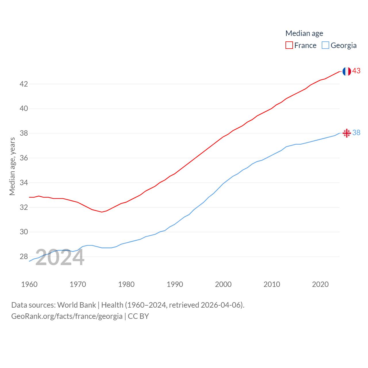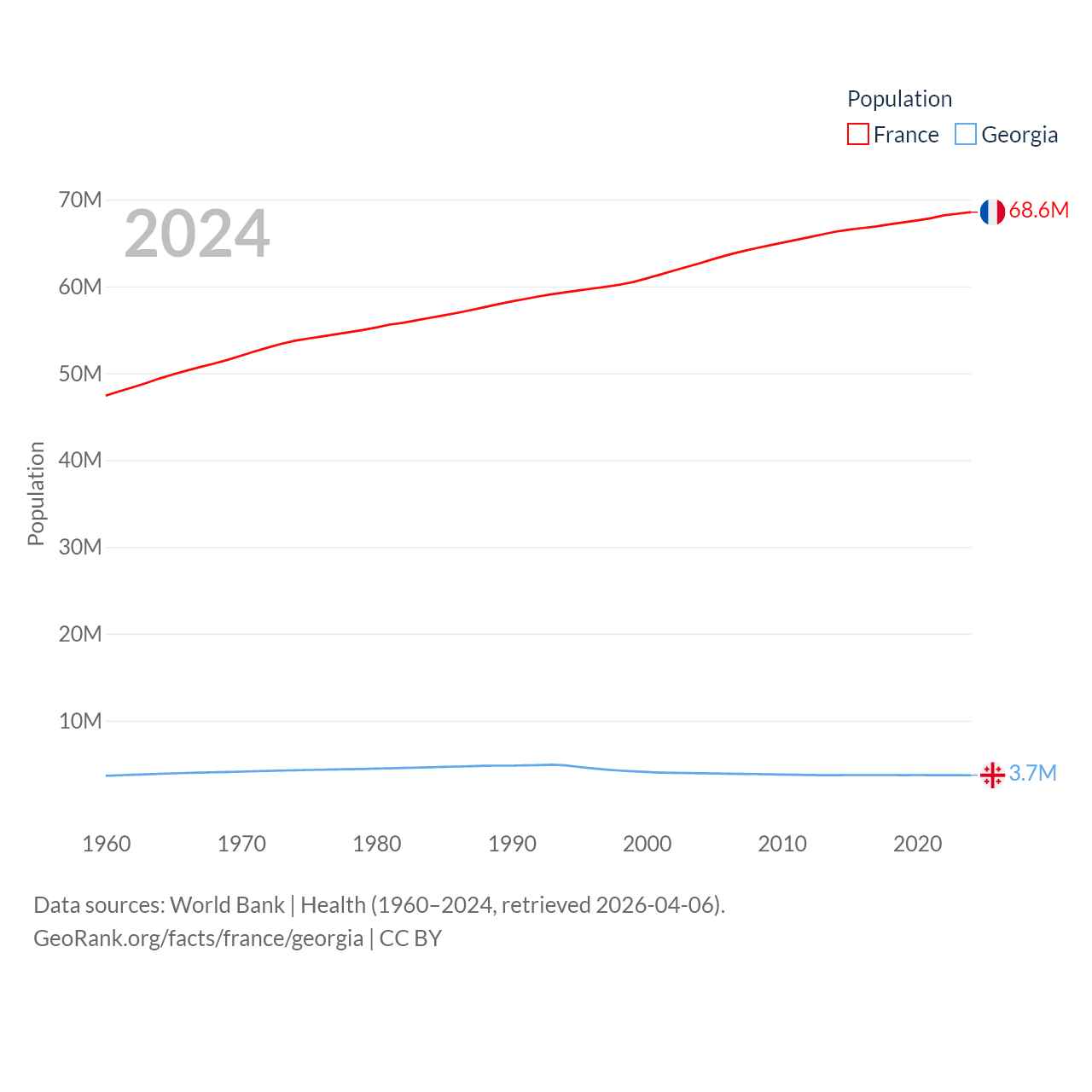 France has a population of 68.6M (ranked 23/197), compared with 3.7M in Georgia (ranked 130/197). France's land area is 208,090 sq mi versus 26,830 sq mi for Georgia (ranked 48th vs. 118th).