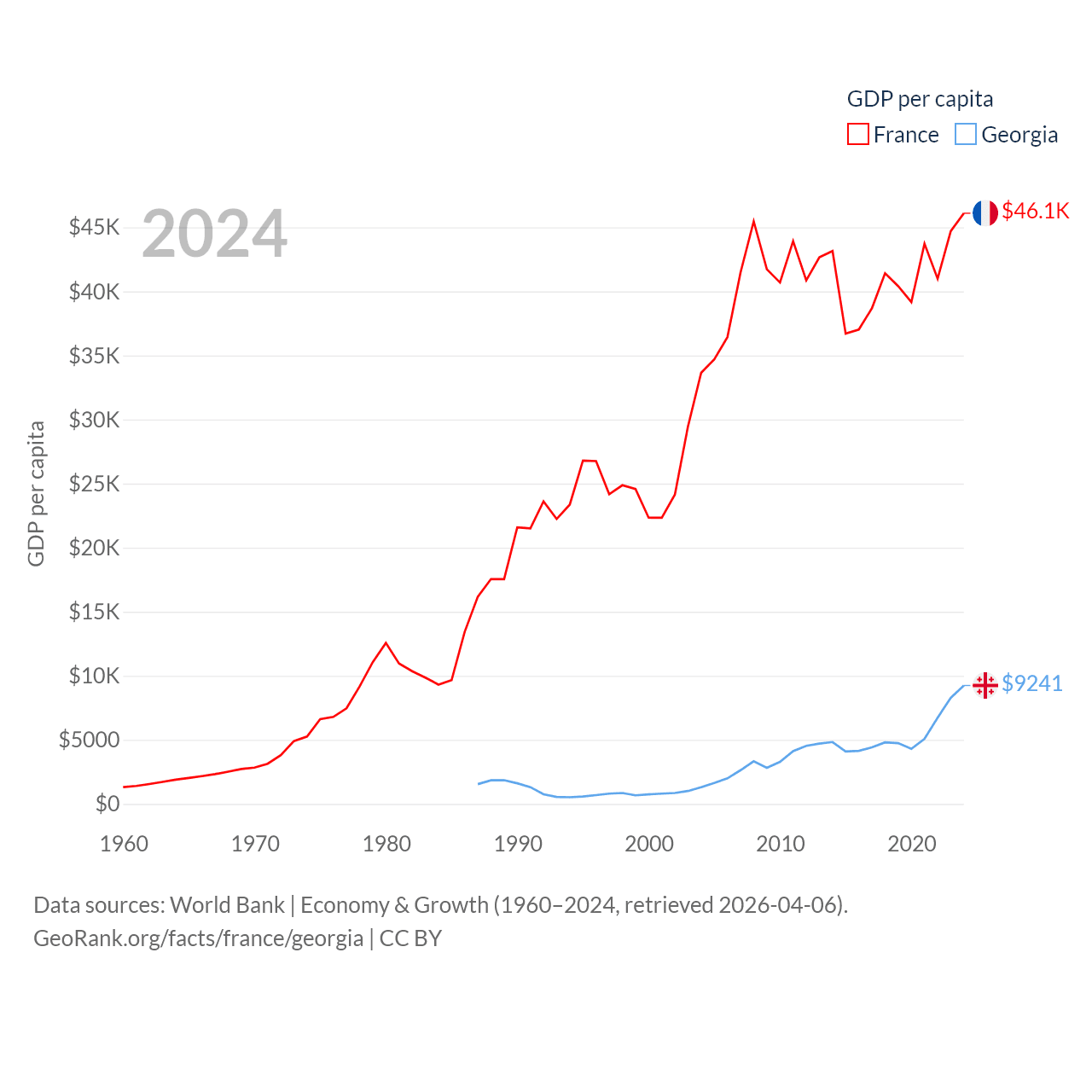 By GDP, France ranks 7/197 ($3.16T) and Georgia ranks 107/197 ($34.2B). By GDP per capita, France ranks 27/197 ($46,103), while Georgia ranks 89/197 ($9,241).