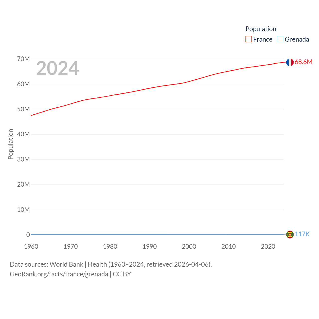 France has a population of 68.6M (ranked 23/197), compared with 117K in Grenada (ranked 182/197). France's land area is 208,090 sq mi versus 131.3 sq mi for Grenada (ranked 48th vs. 186th).