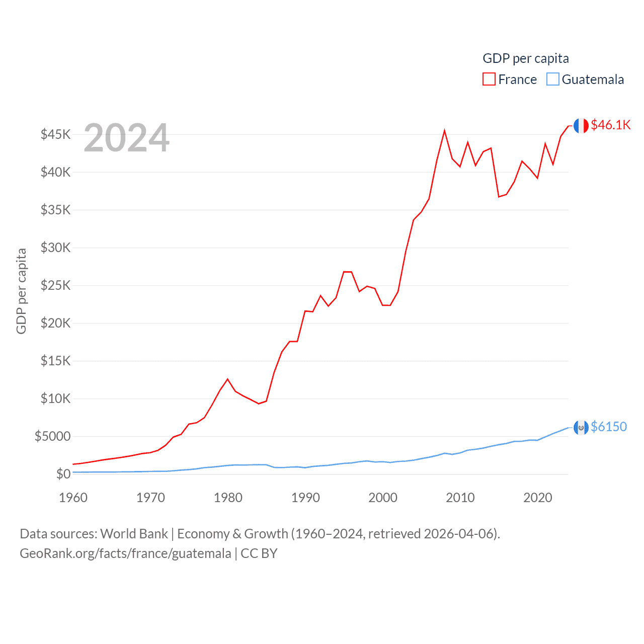 By GDP, France ranks 7/197 ($3.16T) and Guatemala ranks 68/197 ($113B). By GDP per capita, France ranks 27/197 ($46,103), while Guatemala ranks 112/197 ($6,150).