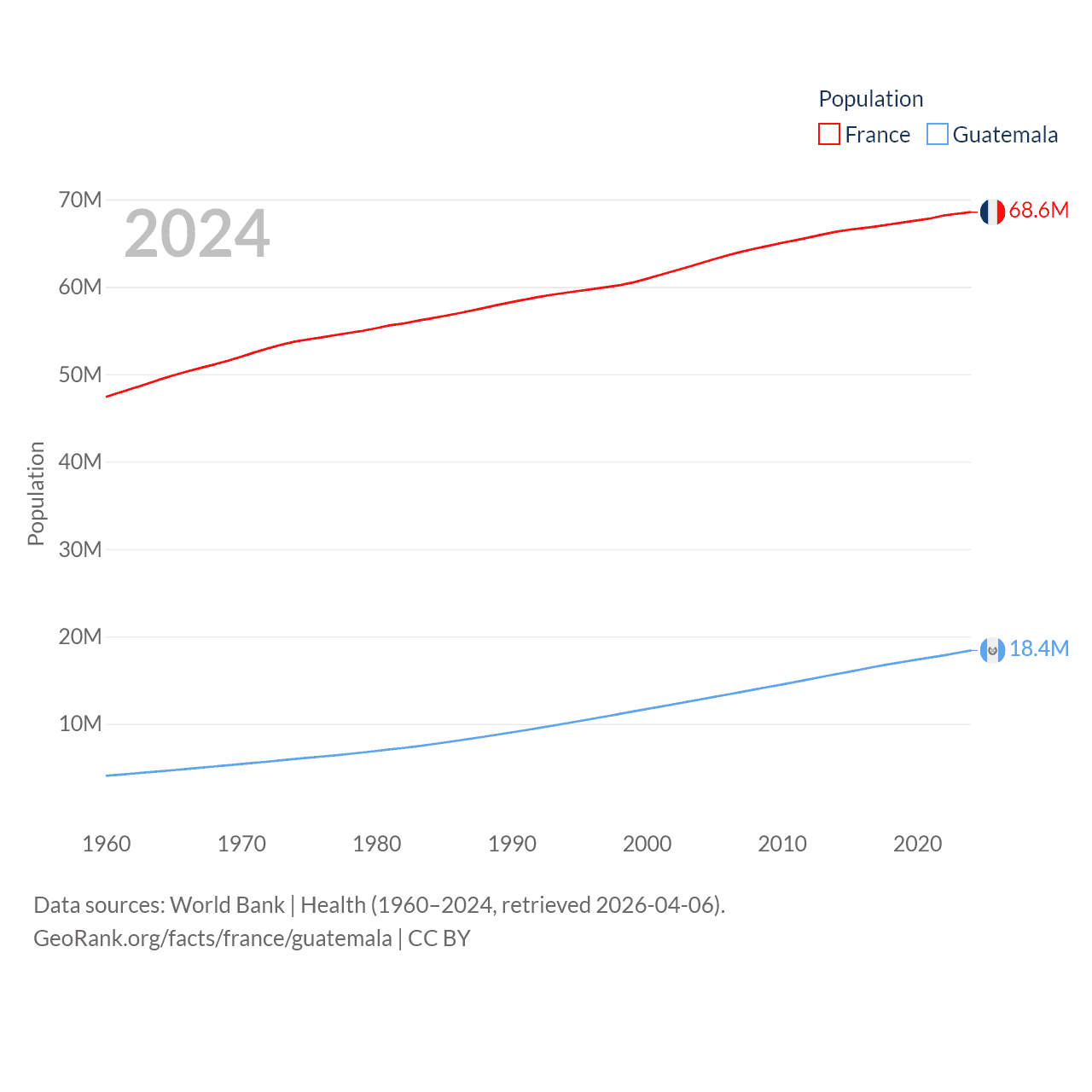 France has a population of 68.6M (ranked 23/197), compared with 18.4M in Guatemala (ranked 70/197). France's land area is 208,090 sq mi versus 41,375 sq mi for Guatemala (ranked 48th vs. 102nd).