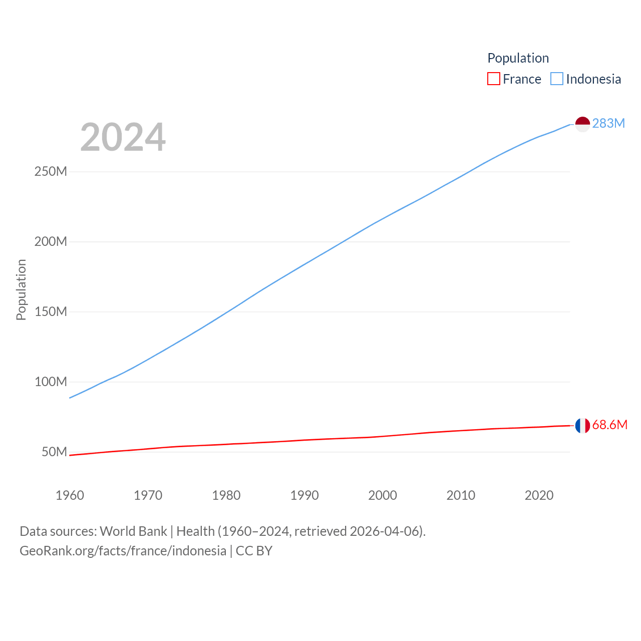 France has a population of 68.6M (ranked 23/197), compared with 283M in Indonesia (ranked 4/197). France's land area is 208,090 sq mi versus 730,720 sq mi for Indonesia (ranked 48th vs. 14th).