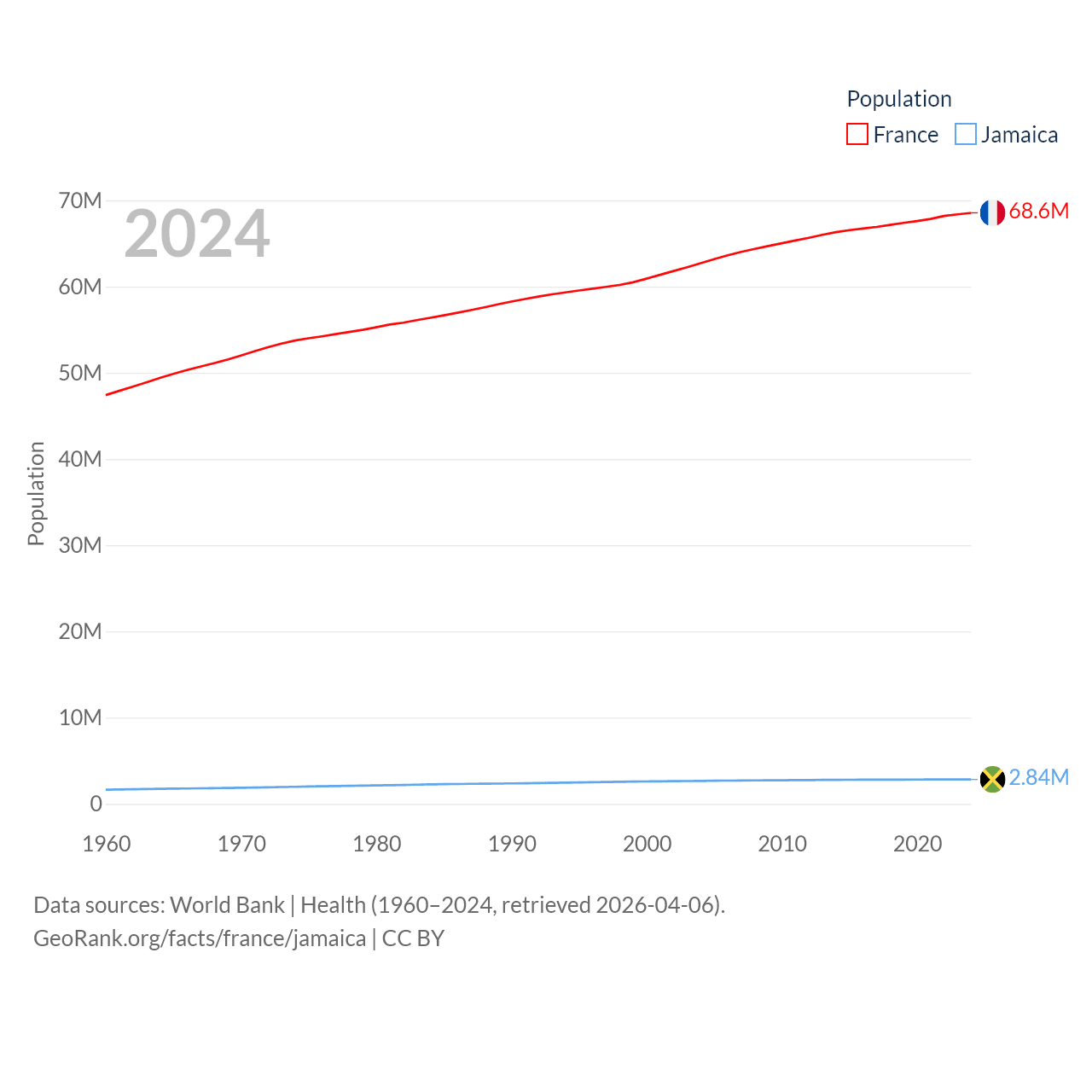 France has a population of 68.6M (ranked 23/197), compared with 2.84M in Jamaica (ranked 139/197). France's land area is 208,090 sq mi versus 4,181 sq mi for Jamaica (ranked 48th vs. 159th).