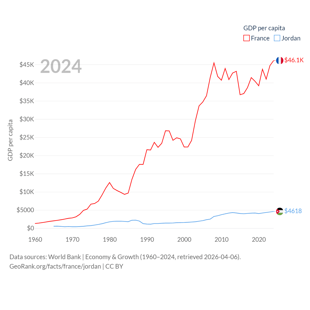 By GDP, France ranks 7/197 ($3.16T) and Jordan ranks 90/197 ($53.4B). By GDP per capita, France ranks 27/197 ($46,103), while Jordan ranks 123/197 ($4,618).