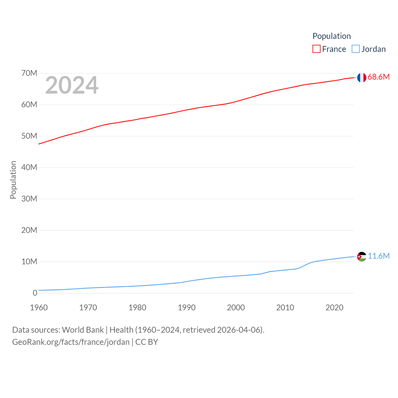 France has a population of 68.6M (ranked 23/197), compared with 11.6M in Jordan (ranked 84/197). France's land area is 208,090 sq mi versus 34,284 sq mi for Jordan (ranked 48th vs. 110th).