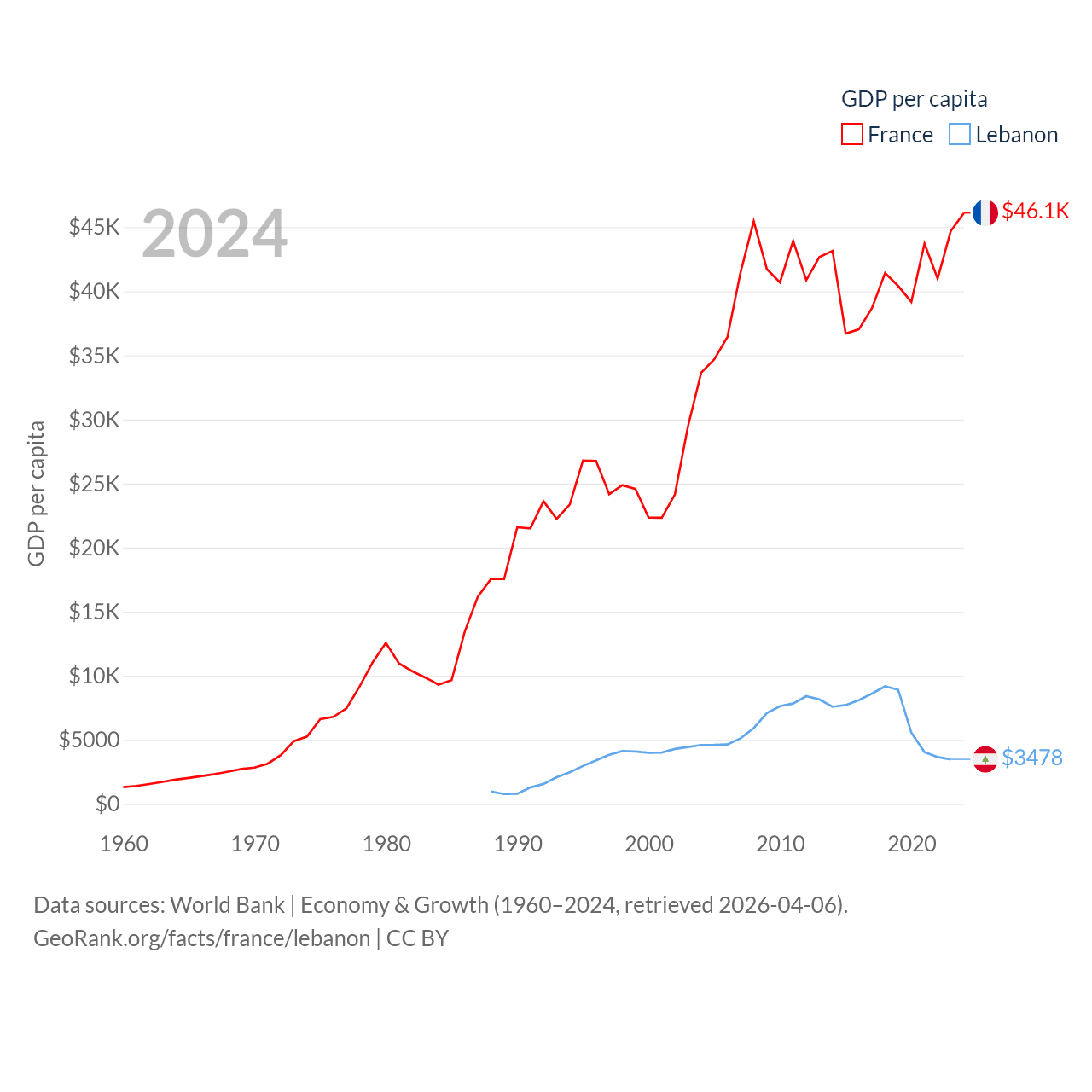 By GDP, France ranks 7/197 ($3.16T) and Lebanon ranks 128/197 ($20.1B). By GDP per capita, France ranks 27/197 ($46,103), while Lebanon ranks 135/197 ($3,478).
