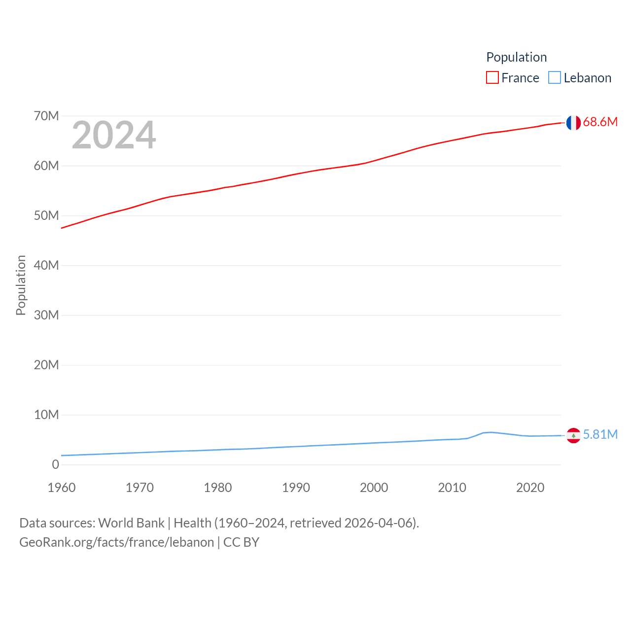 France has a population of 68.6M (ranked 23/197), compared with 5.81M in Lebanon (ranked 115/197). France's land area is 208,090 sq mi versus 3,950 sq mi for Lebanon (ranked 48th vs. 160th).