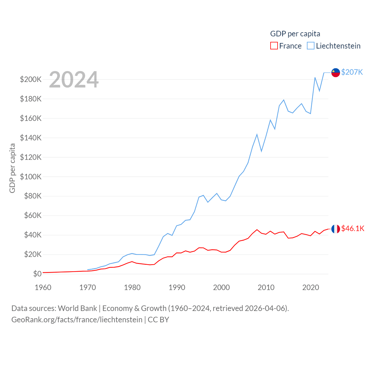 By GDP, France ranks 7/197 ($3.16T) and Liechtenstein ranks 156/197 ($8.24B). By GDP per capita, France ranks 27/197 ($46,103), while Liechtenstein ranks 2/197 ($206,781).