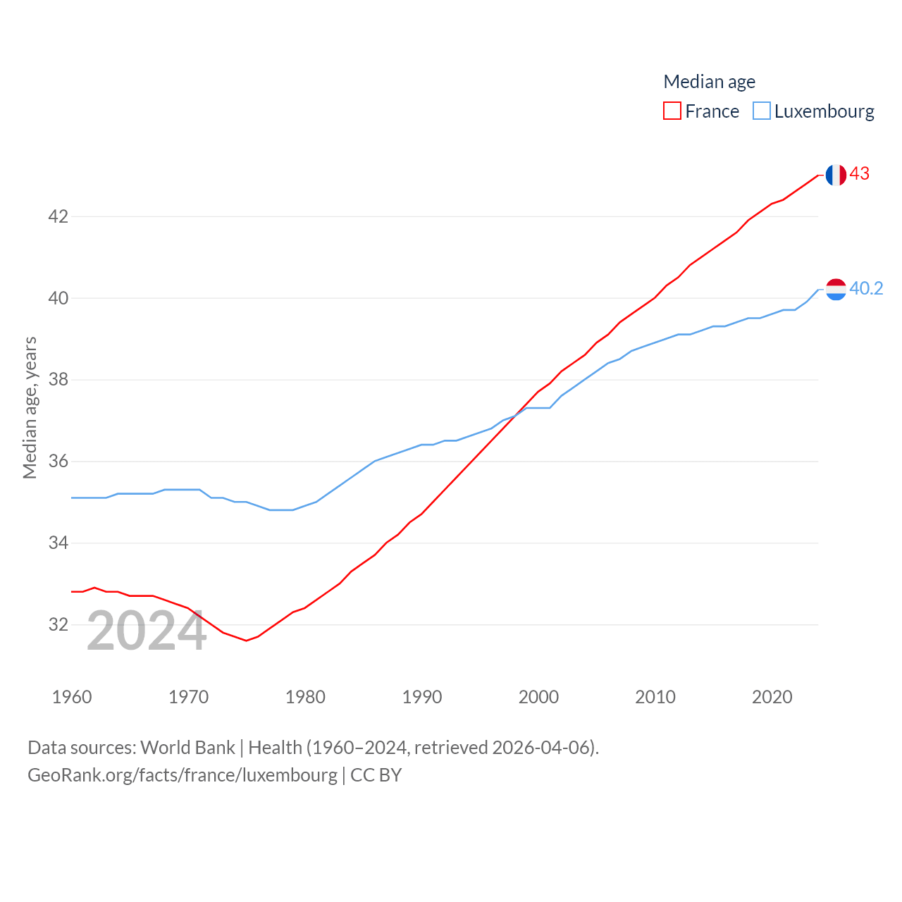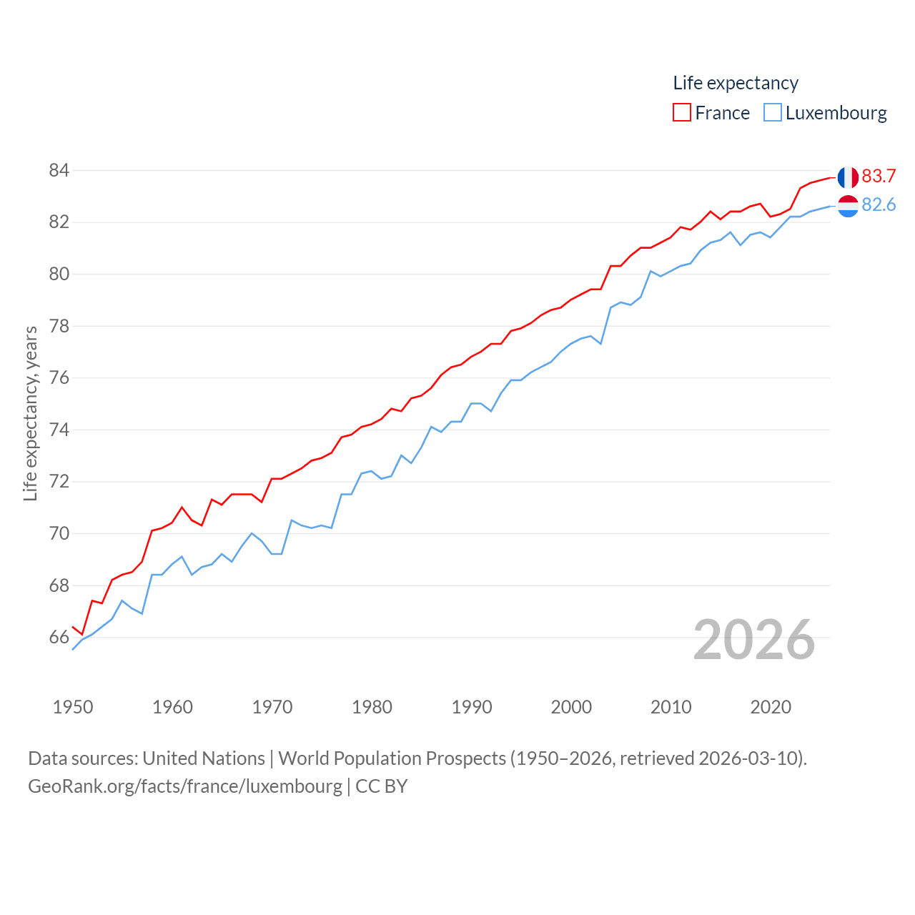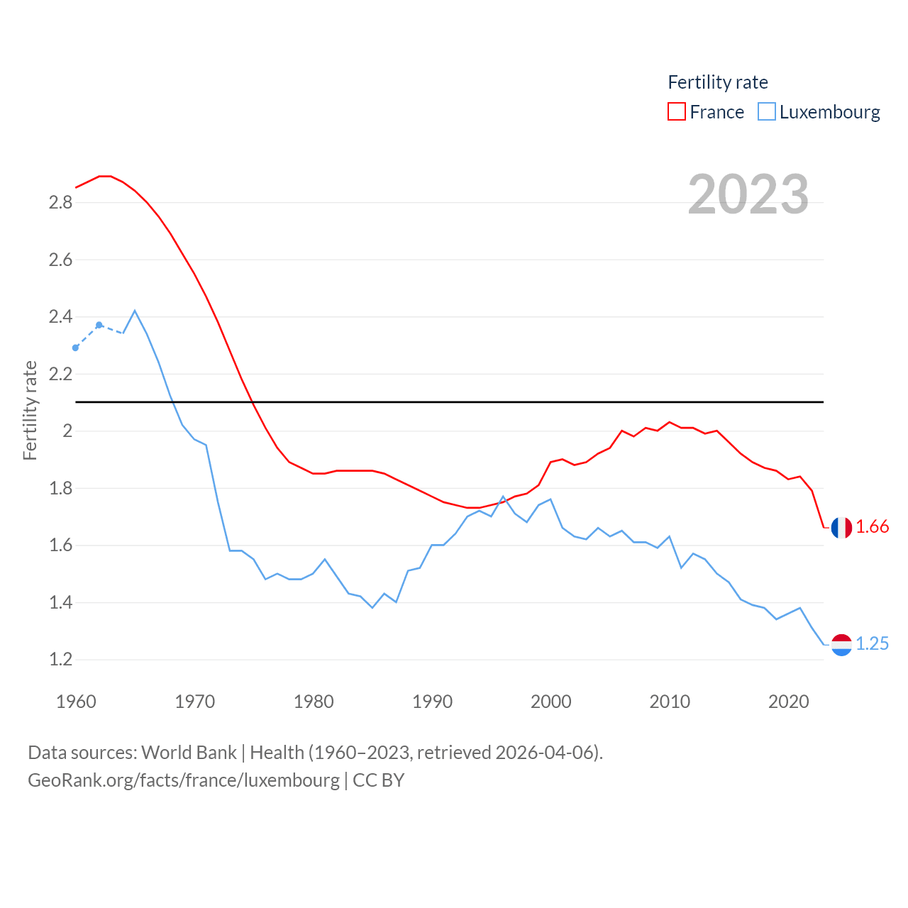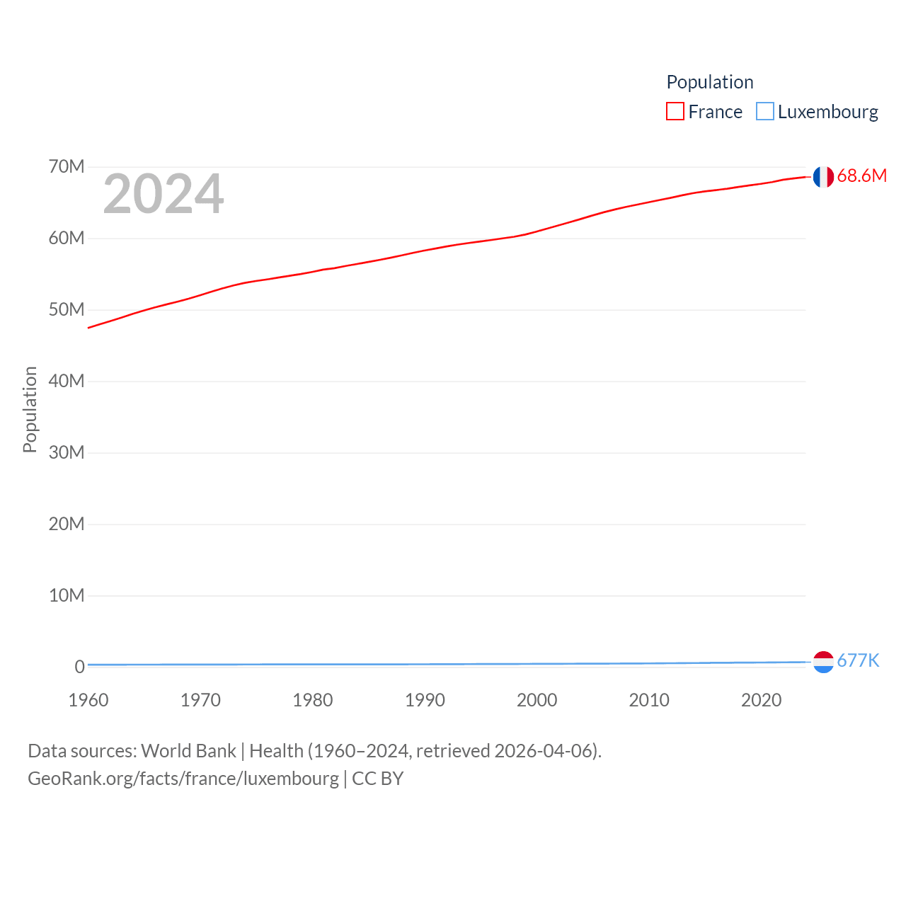 France has a population of 68.6M (ranked 23/197), compared with 677K in Luxembourg (ranked 164/197). France's land area is 208,090 sq mi versus 994 sq mi for Luxembourg (ranked 48th vs. 169th).