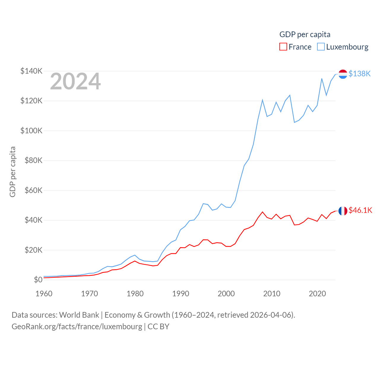 By GDP, France ranks 7/197 ($3.16T) and Luxembourg ranks 74/197 ($93.3B). By GDP per capita, France ranks 27/197 ($46,103), while Luxembourg ranks 3/197 ($137,782).