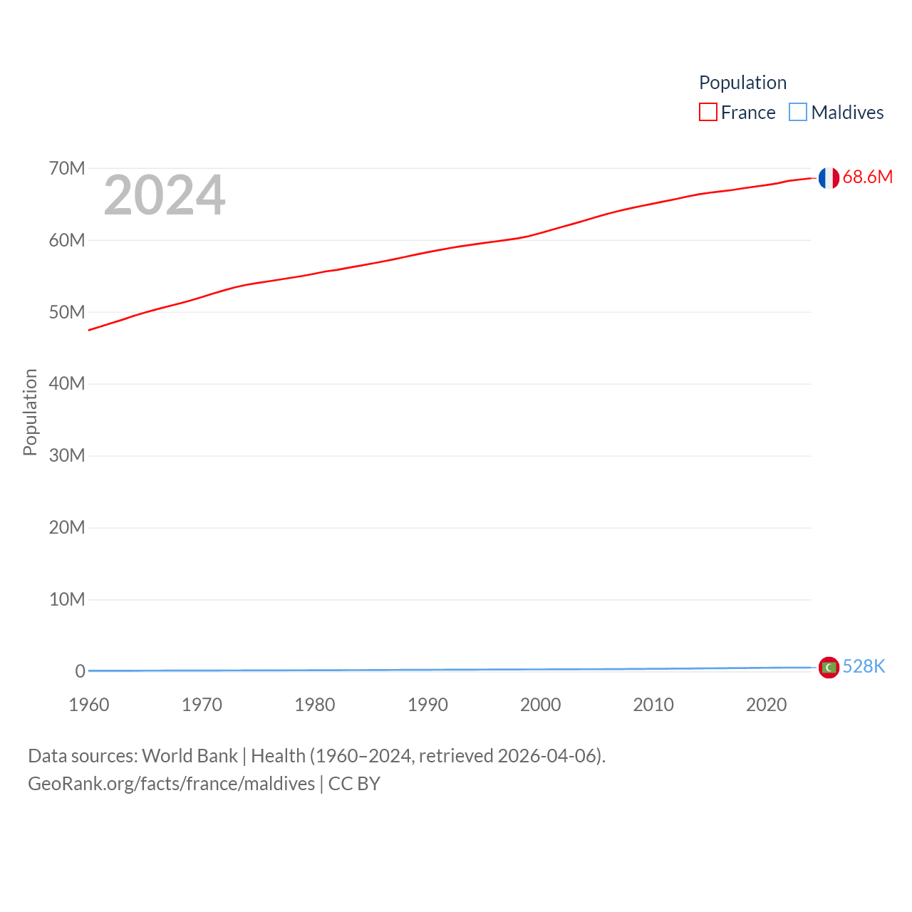 France has a population of 68.6M (ranked 23/197), compared with 528K in Maldives (ranked 168/197). France's land area is 208,090 sq mi versus 115.1 sq mi for Maldives (ranked 48th vs. 188th).