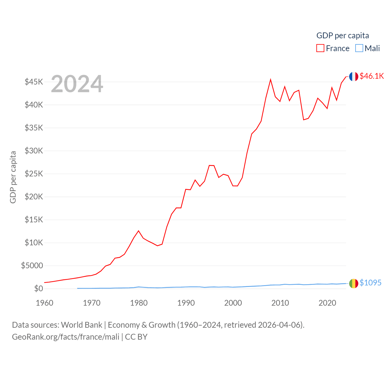 By GDP, France ranks 7/197 ($3.16T) and Mali ranks 113/197 ($26.8B). By GDP per capita, France ranks 27/197 ($46,103), while Mali ranks 173/197 ($1,095).